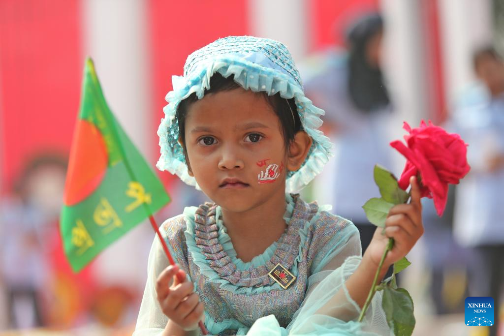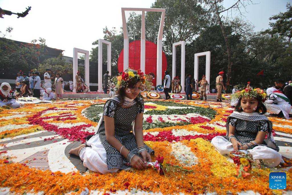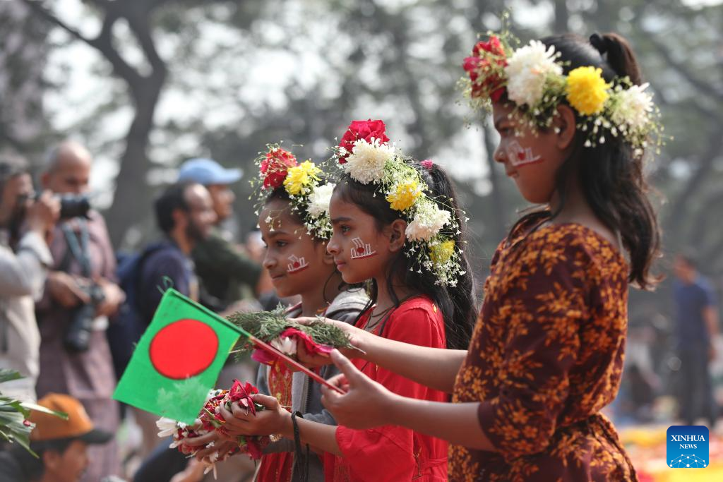 Children take part in a memorial observing International Mother Language Day in Dhaka, Bangladesh, Feb. 21, 2025. Hundreds of thousands of people in Bangladeshi capital Dhaka Friday paid tributes to the country's language movement activists who sacrificed their lives on the day in 1952. (Photo by Habibur Rahman/Xinhua)