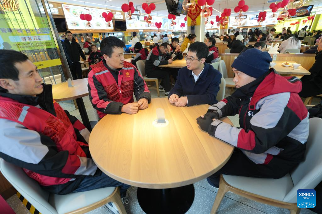 Hu Dongfang (2nd R, front) talks with deliverymen at a restaurant serving outdoor workers in Wenzhou City, east China's Zhejiang Province on Feb. 18, 2025. (Xinhua/Weng Xinyang)