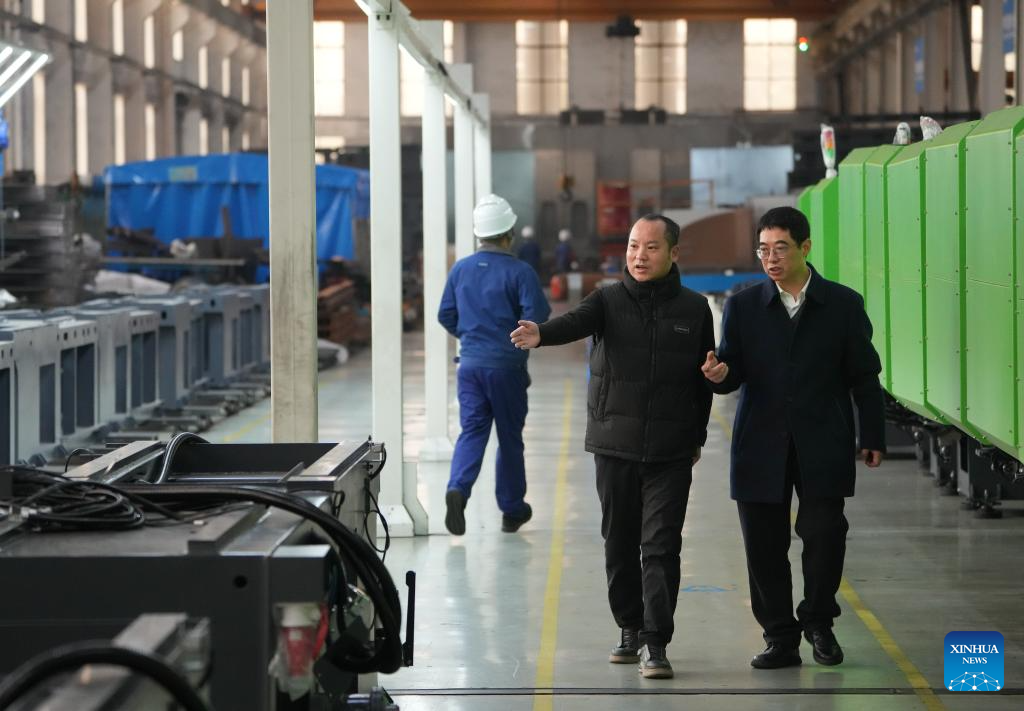 The staff member in charge of production introduces the independent innovation of the enterprise to Hu Dongfang (L) in a specialized and innovative enterprise in Wenzhou City, east China's Zhejiang Province on Feb. 18, 2025. (Xinhua/Weng Xinyang)