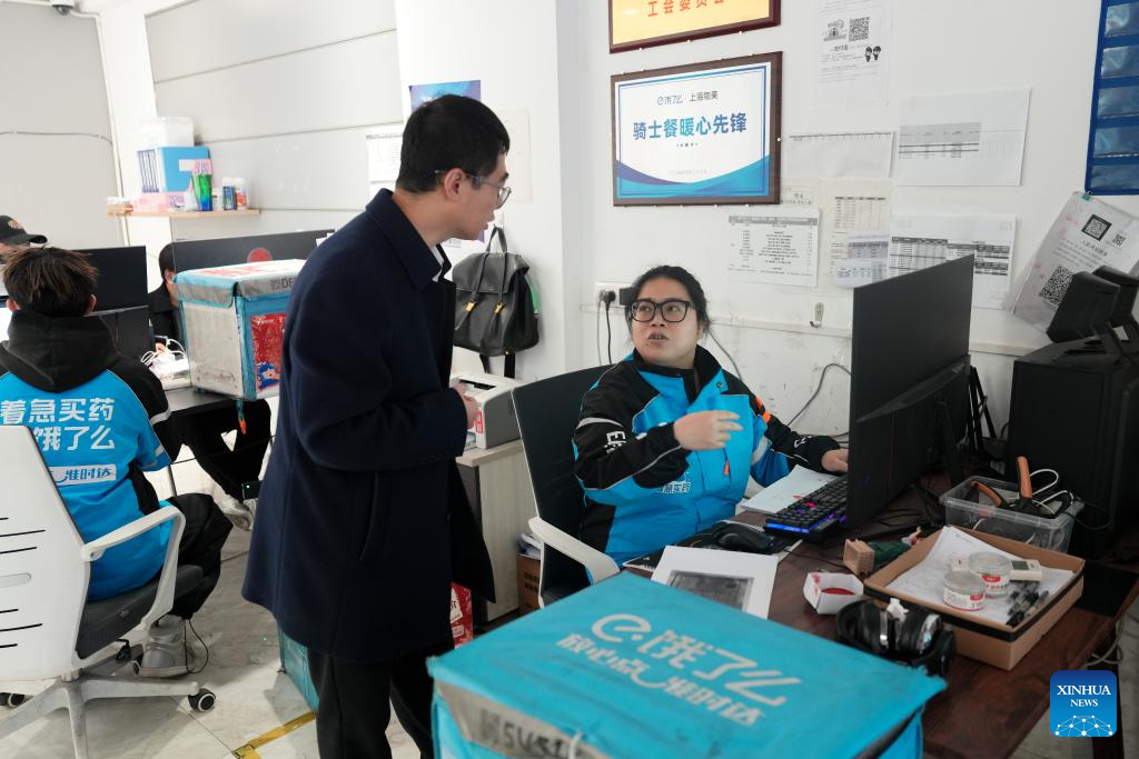 Hu Dongfang (2nd R) communicates with a staff member at a takeaway rider dispatch station in Wenzhou City, east China's Zhejiang Province on Feb. 18, 2025. (Xinhua/Weng Xinyang)