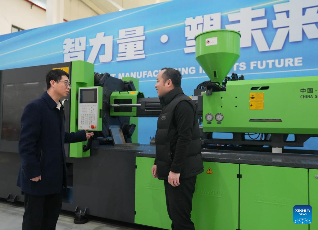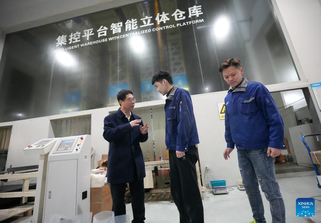 Hu Dongfang (L) learns about the operation of smart devices from a worker in a specialized and innovative enterprise in Wenzhou City, east China's Zhejiang Province on Feb. 18, 2025. (Xinhua/Weng Xinyang)