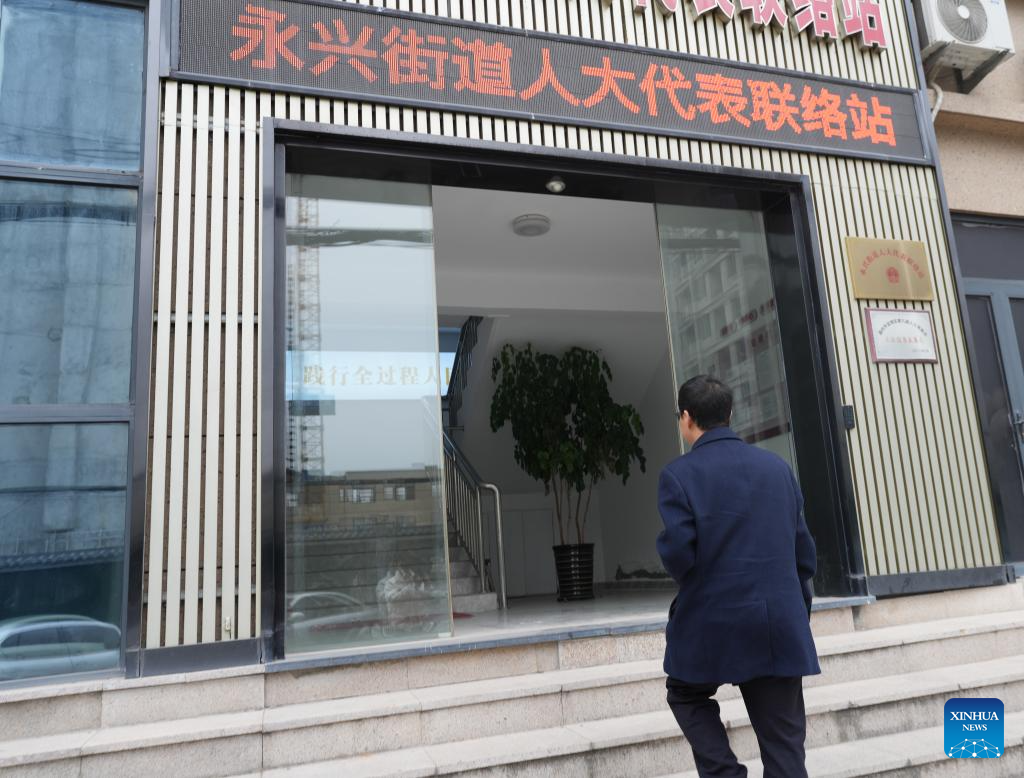 Hu Dongfang arrives at the liaison station for National People's Congress deputies for a weekly meeting in Longwan District of Wenzhou City, east China's Zhejiang Province on Feb. 18, 2025. (Xinhua/Weng Xinyang)