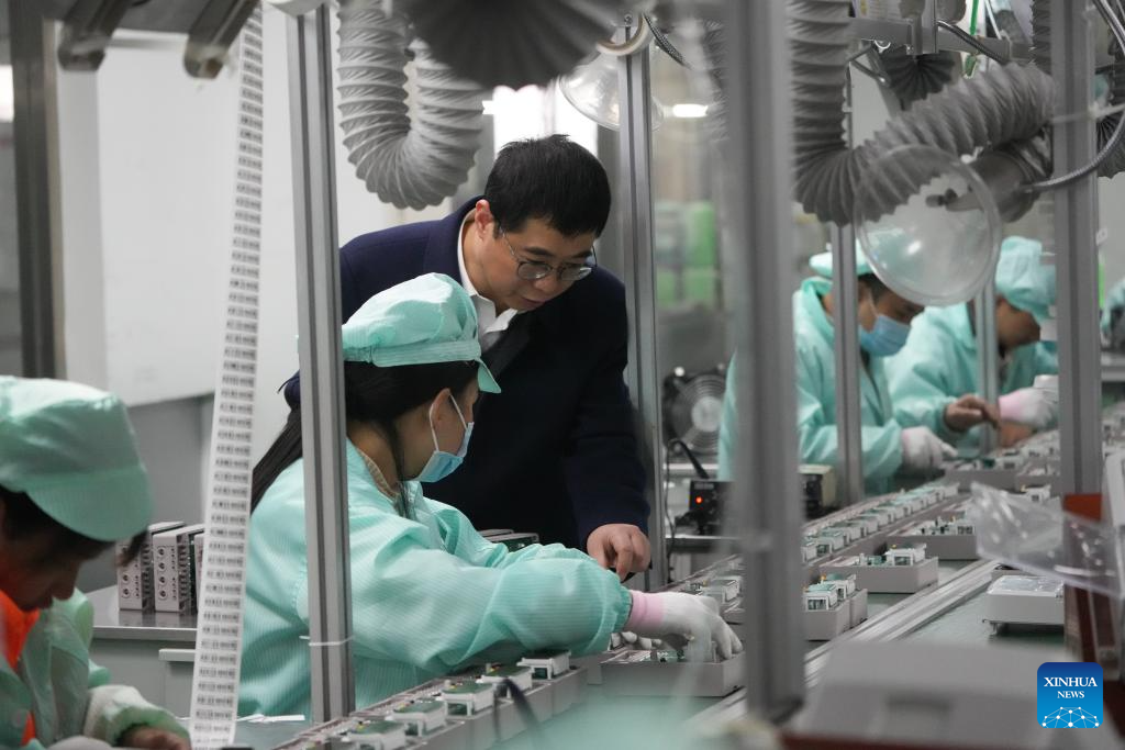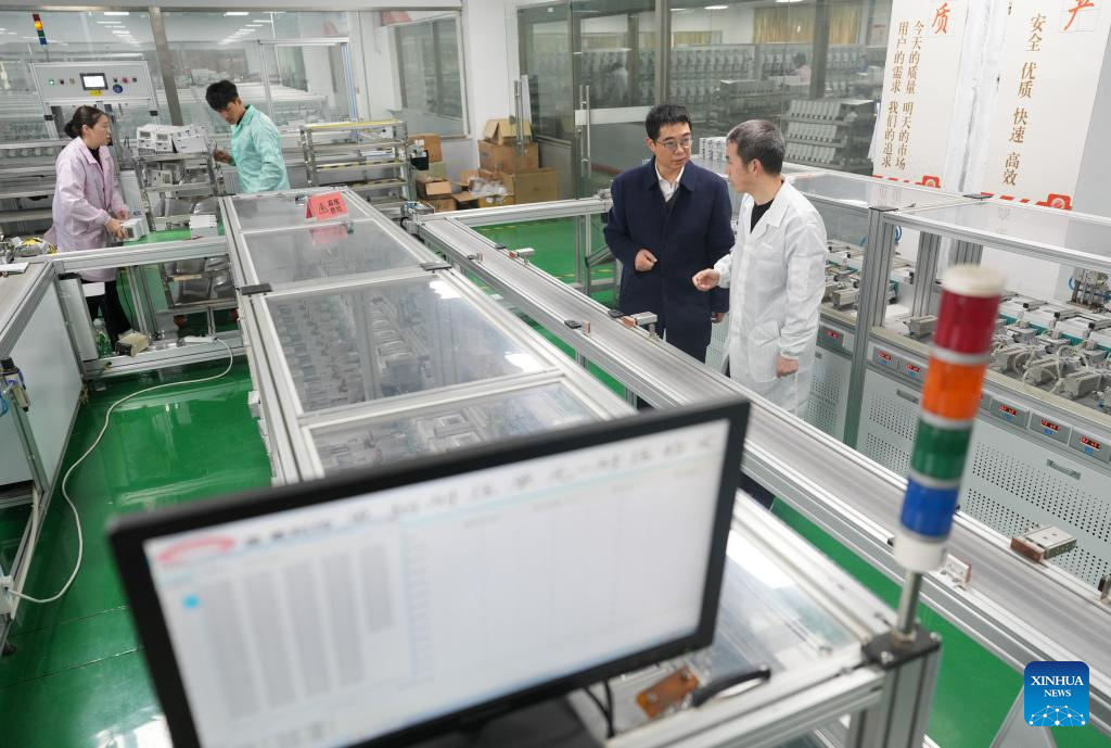 Hu Dongfang (C) communicates with a worker in a specialized and innovative enterprise in Longwan District of Wenzhou City, east China's Zhejiang Province on Feb. 18, 2025. Hu Dongfang, a deputy to the National People's Congress (NPC), is the deputy chief engineer of Zhejiang Risesun Science and Technology Co., Ltd., located in Wenzhou City. He focuses on the research and development of smart meters and charging piles, and has obtained 24 authorized invention patents. From an ordinary worker to a well-known mold designer in the industry, Hu attributed his experience to tireless research and innovation.