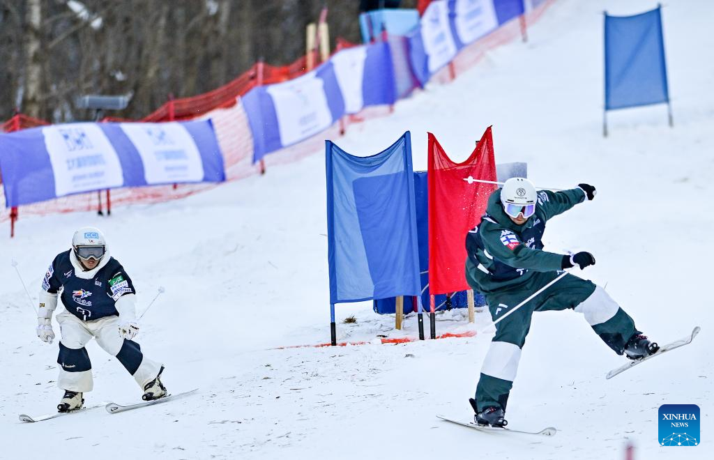 Horishima Ikuma (L) of Japan competes with Severi Vierela of Finland during the final of Men's Dual Moguls at 2024-2025 FIS Freestyle Ski World Cup at the Beidahu Ski Resort in Jilin City, northeast China's Jilin Province, Feb. 22, 2025. (Xinhua/Yan Linyun)
