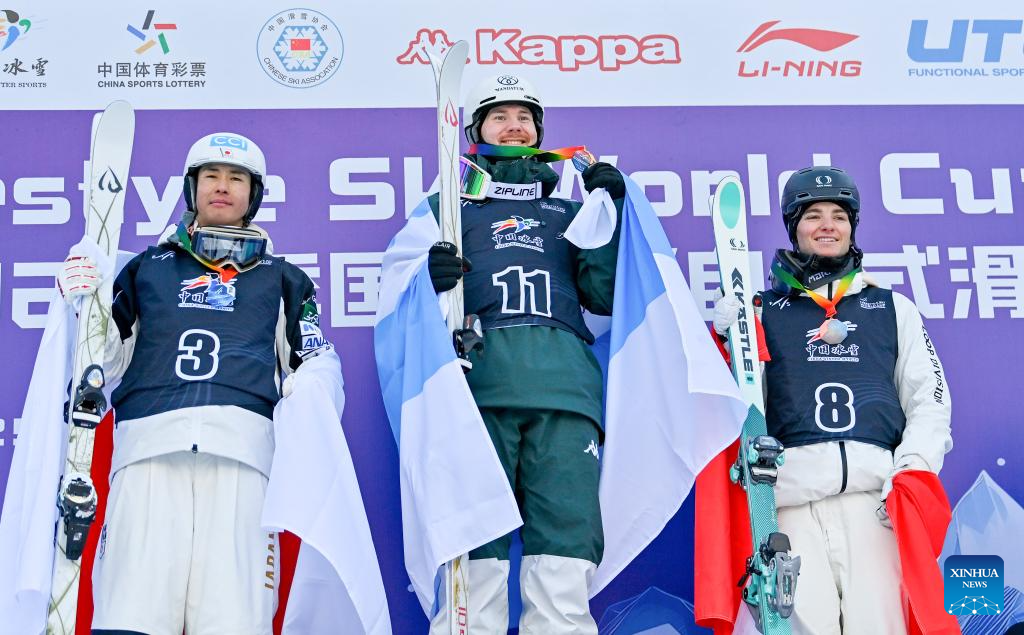 Silver medalist Horishima Ikuma of Japan, gold medalist Severi Vierela of Finland and bronze medalist Julien Viel of Canada (L to R) pose for a group photo after the final of Men's Dual Moguls at 2024-2025 FIS Freestyle Ski World Cup at the Beidahu Ski Resort in Jilin City, northeast China's Jilin Province, Feb. 22, 2025. (Xinhua/Yan Linyun)