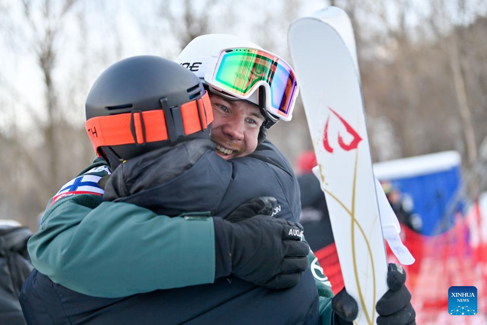 Severi Vierela (R) of Finland celebrates after the final of Men's Dual Moguls at 2024-2025 FIS Freestyle Ski World Cup at the Beidahu Ski Resort in Jilin City, northeast China's Jilin Province, Feb. 22, 2025. (Xinhua/Yan Linyun)