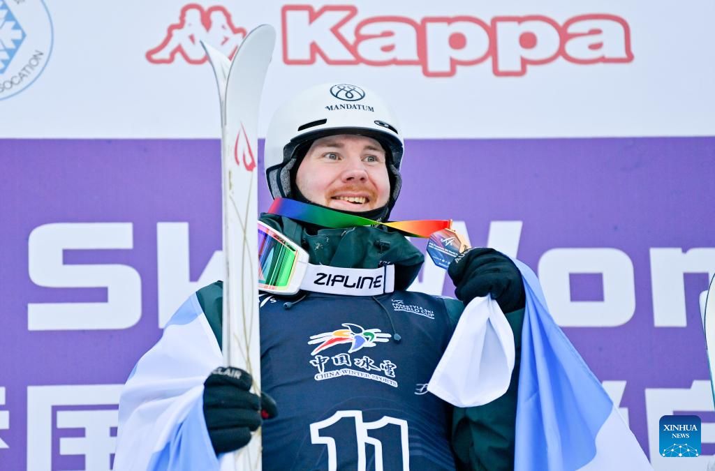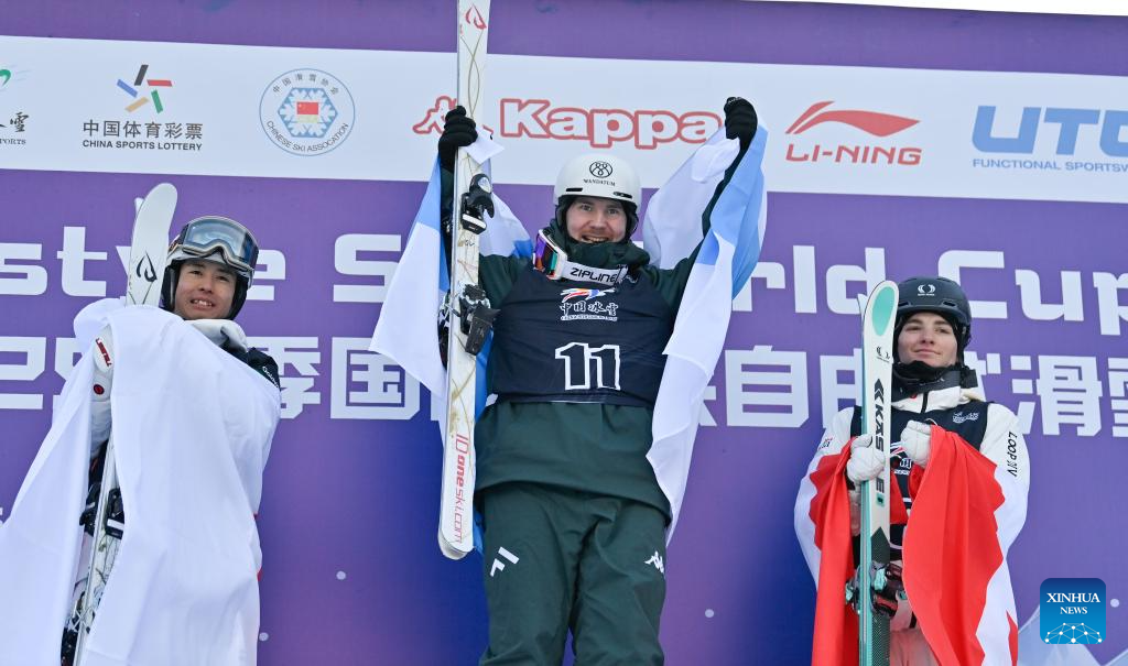 Gold medalist Severi Vierela of Finland celebrates after the final of Men's Dual Moguls at 2024-2025 FIS Freestyle Ski World Cup at the Beidahu Ski Resort in Jilin City, northeast China's Jilin Province, Feb. 22, 2025. (Xinhua/Yan Linyun)