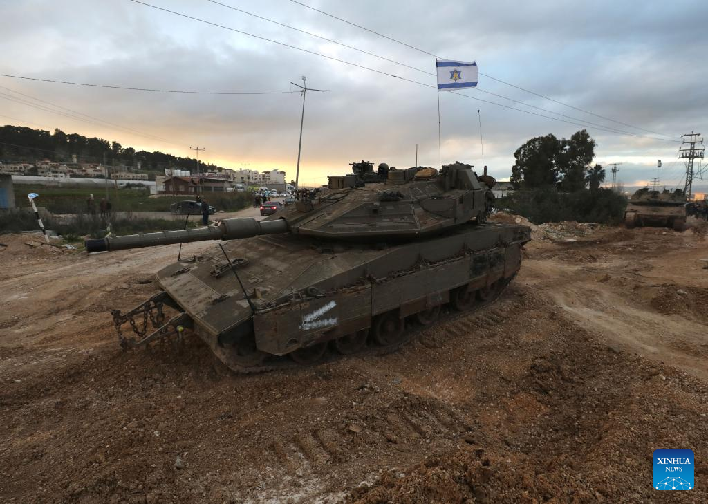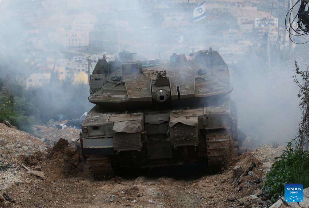 An Israeli military vehicle is seen during a military operation in the West Bank city of Jenin, on Feb. 24, 2025. Israeli Defense Minister Israel Katz on Sunday ordered the military to prepare for a yearlong presence in refugee camps in the West Bank as Israel escalates the ongoing large-scale military campaign in the occupied Palestinian territory. (Photo by Nidal Eshtayeh/Xinhua)