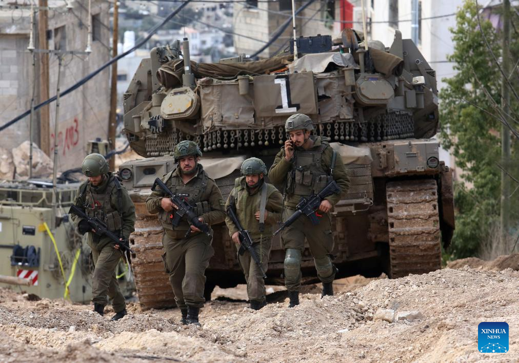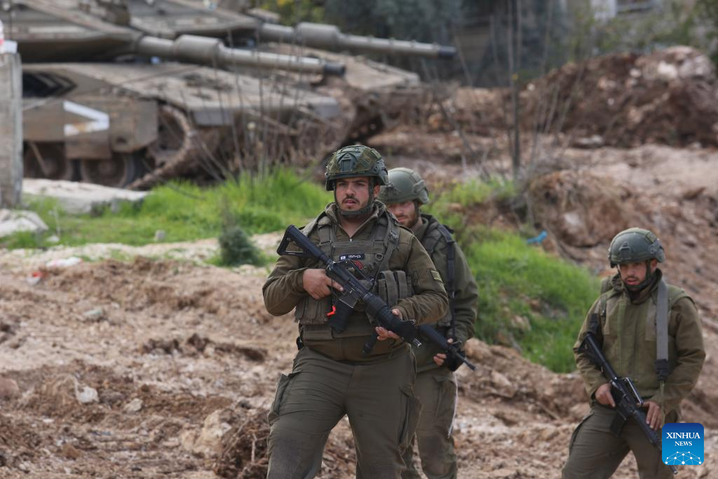 Israeli soldiers are seen during a military operation in the West Bank city of Jenin, on Feb. 24, 2025. Israeli Defense Minister Israel Katz on Sunday ordered the military to prepare for a yearlong presence in refugee camps in the West Bank as Israel escalates the ongoing large-scale military campaign in the occupied Palestinian territory. (Photo by Nidal Eshtayeh/Xinhua)