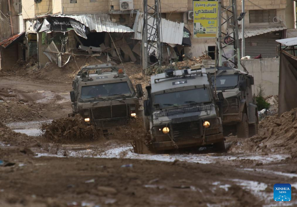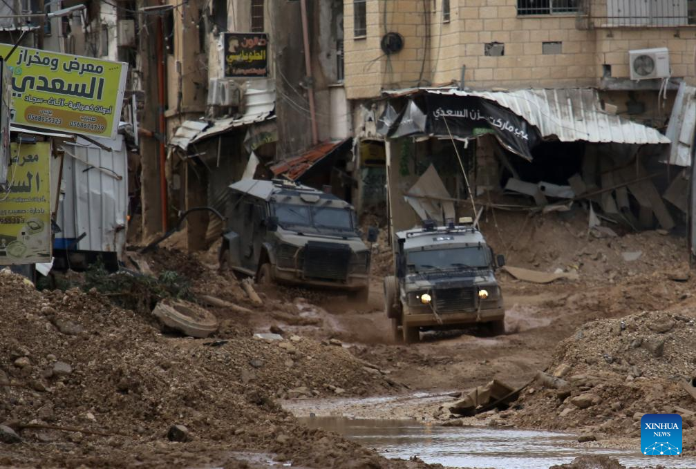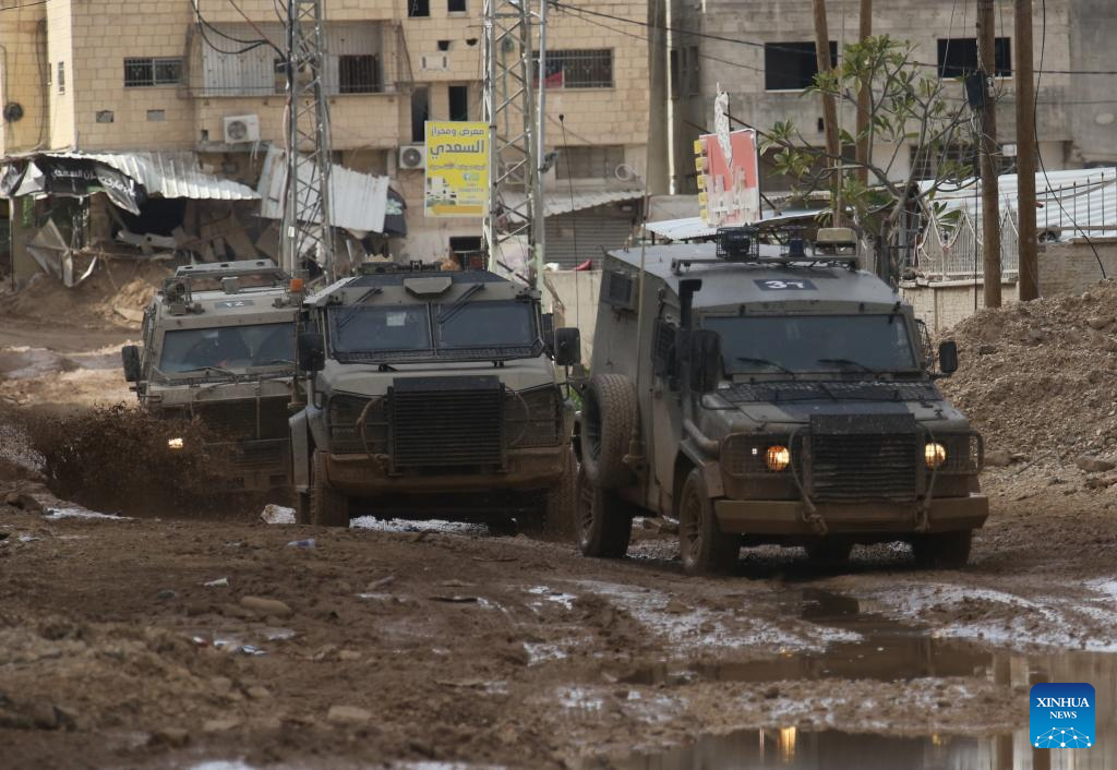 Israeli military vehicles are seen during a military operation in the West Bank city of Jenin, on Feb. 24, 2025. Israeli Defense Minister Israel Katz on Sunday ordered the military to prepare for a yearlong presence in refugee camps in the West Bank as Israel escalates the ongoing large-scale military campaign in the occupied Palestinian territory. (Photo by Nidal Eshtayeh/Xinhua)