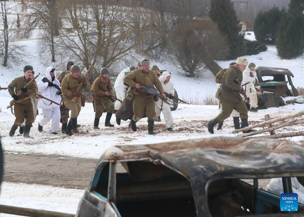 Actors perform in an event featuring a re-enactment of WWII battle hosted by a museum in the suburbs of Minsk, Belarus, Feb. 22, 2025. February 23rd marks the Defender of the Fatherland Day in Belarus. (Photo by Henadz Zhinkov/Xinhua)