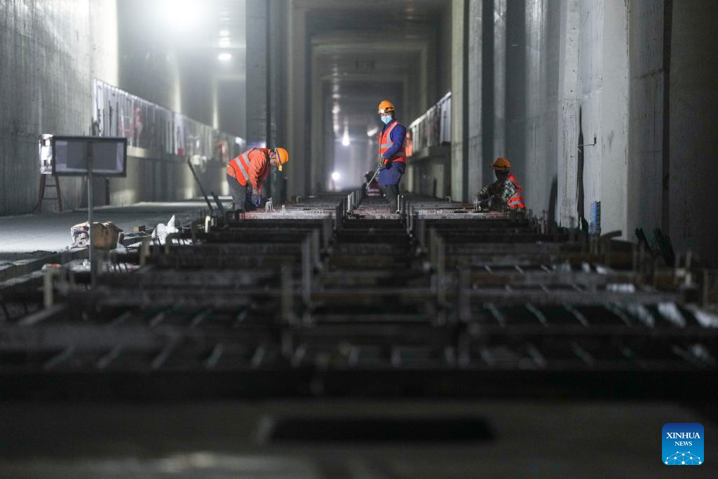 Workers are busy laying tracks at the construction site of the Beijing Sub-center Station along the Beijing-Tangshan intercity railway in Tongzhou District, sub-center of Beijing, capital of China, Feb. 22, 2025. With a designed speed of 350 km per hour, the 148.7-km-long Beijing-Tangshan intercity railway will link Beijing sub-center comprehensive transportation hub in Beijing and Tangshan City in Hebei Province after completion of the Beijing section of the route. (Xinhua/Ju Huanzong)