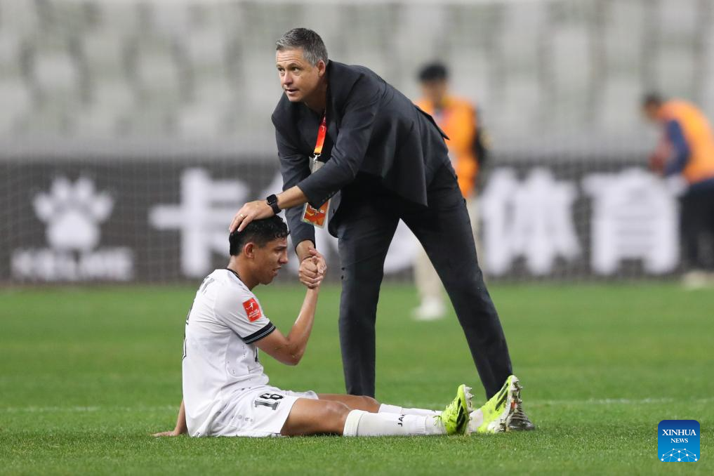 Australia's head coach Trevor Morgan (R) comforts Iraq's Yasir Wisam Abboodi after the quarterfinal between Australia and Iraq at the AFC U20 Asian Cup football tournament in Shenzhen, south China's Guangdong Province, Feb. 22, 2025. (Xinhua/Li Xulun)