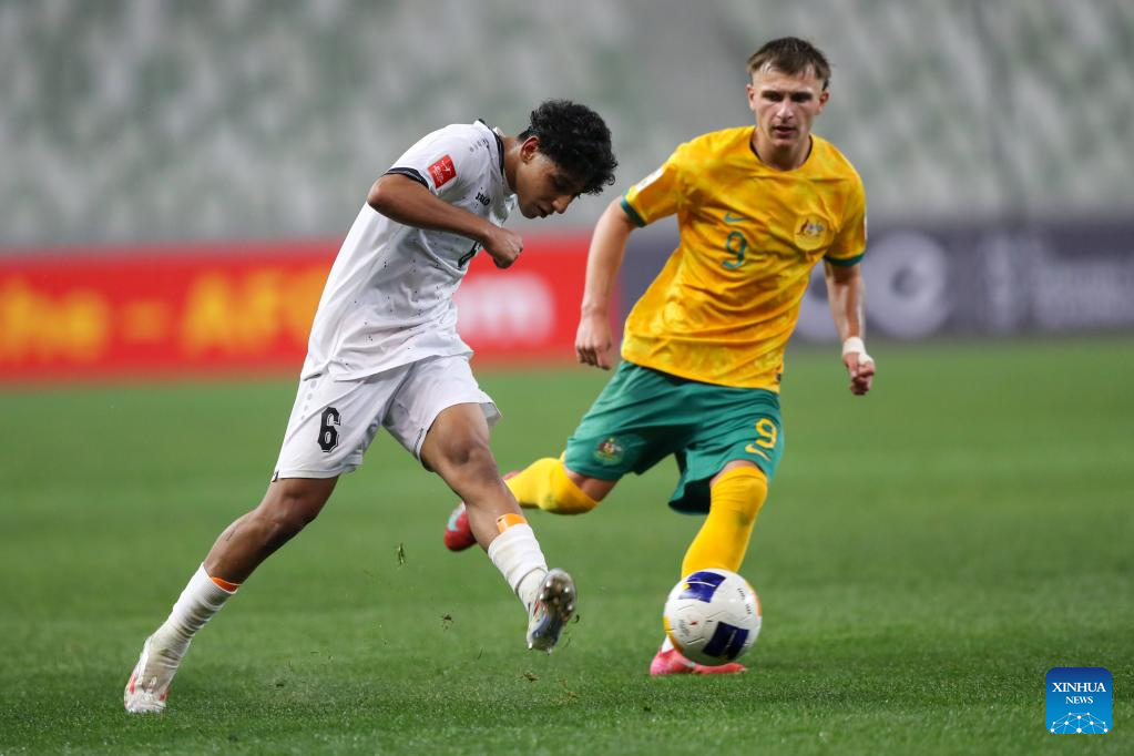 Hussein Fahem Al-Quraishi (L) of Iraq shoots during the quarterfinal between Australia and Iraq at the AFC U20 Asian Cup football tournament in Shenzhen, south China's Guangdong Province, Feb. 22, 2025. (Xinhua/Li Xulun)