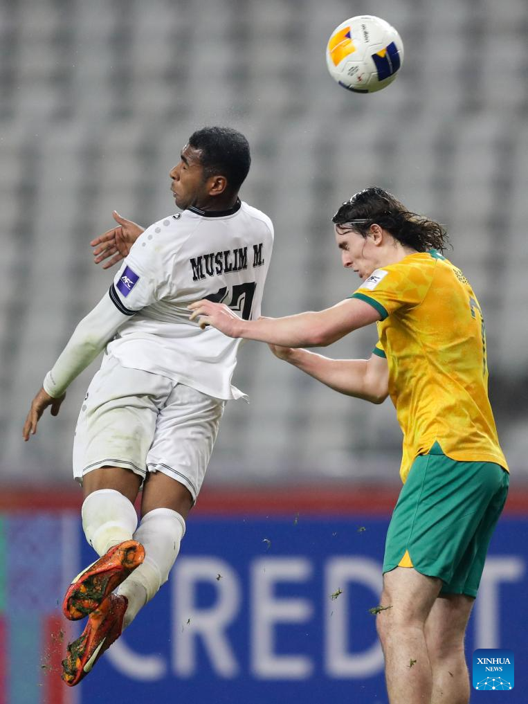 Muslim Mousa Al-Hamadani (L) of Iraq heads for the ball with Daniel Bennie of Australia during the quarterfinal between Australia and Iraq at the AFC U20 Asian Cup football tournament in Shenzhen, south China's Guangdong Province, Feb. 22, 2025. (Xinhua/Li Xulun)