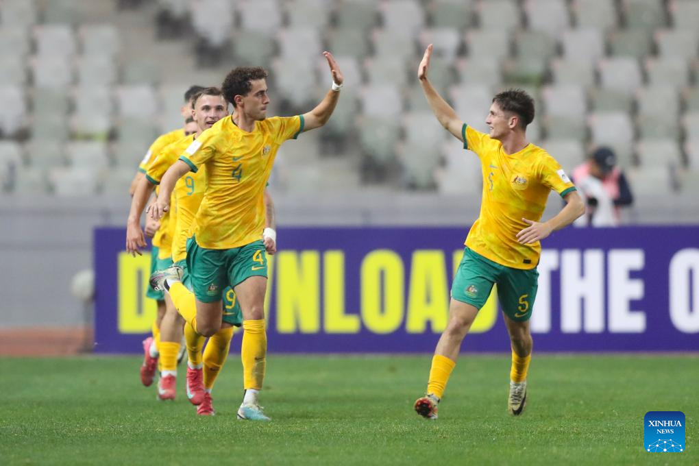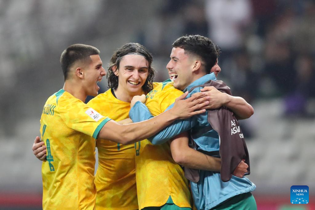 Australia's players celebrate after winning the quarterfinal between Australia and Iraq at the AFC U20 Asian Cup football tournament in Shenzhen, south China's Guangdong Province, Feb. 22, 2025. (Xinhua/Li Xulun)