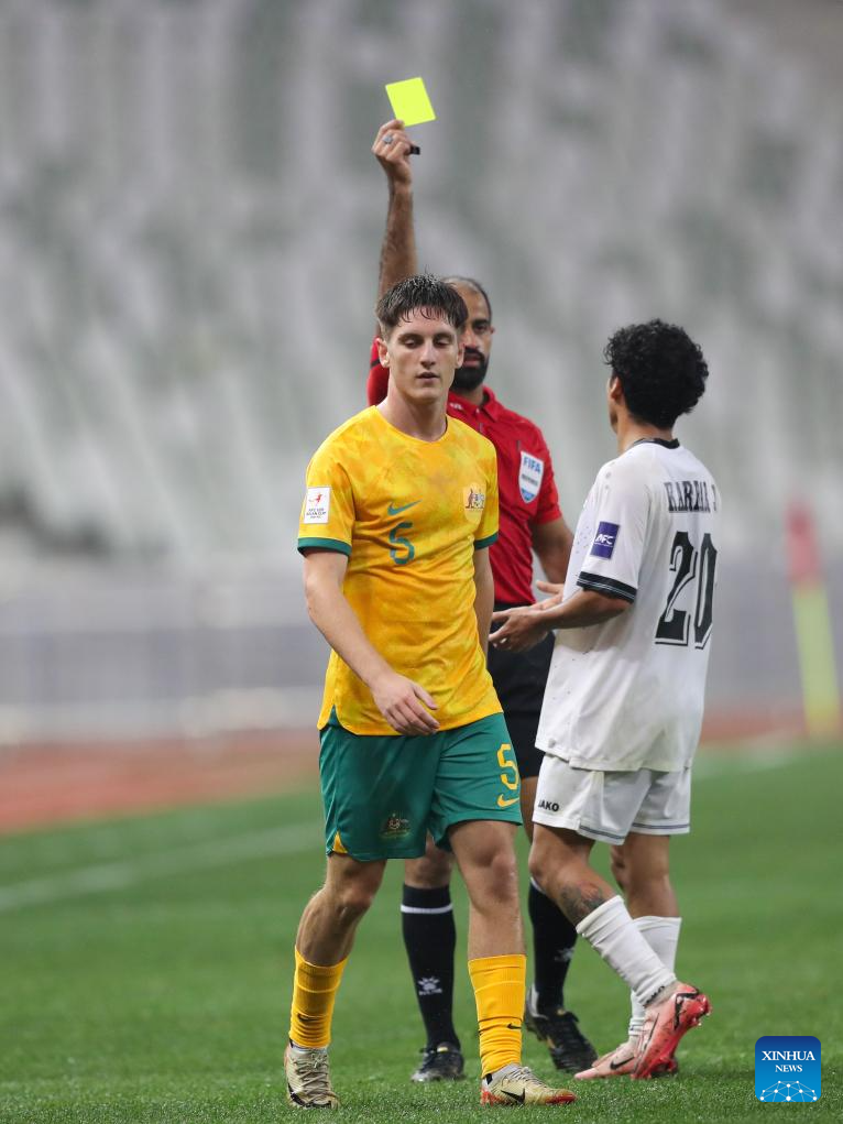 Fabian Talladira (L) of Australia is given a yellow card during the quarterfinal between Australia and Iraq at the AFC U20 Asian Cup football tournament in Shenzhen, south China's Guangdong Province, Feb. 22, 2025. (Xinhua/Li Xulun)