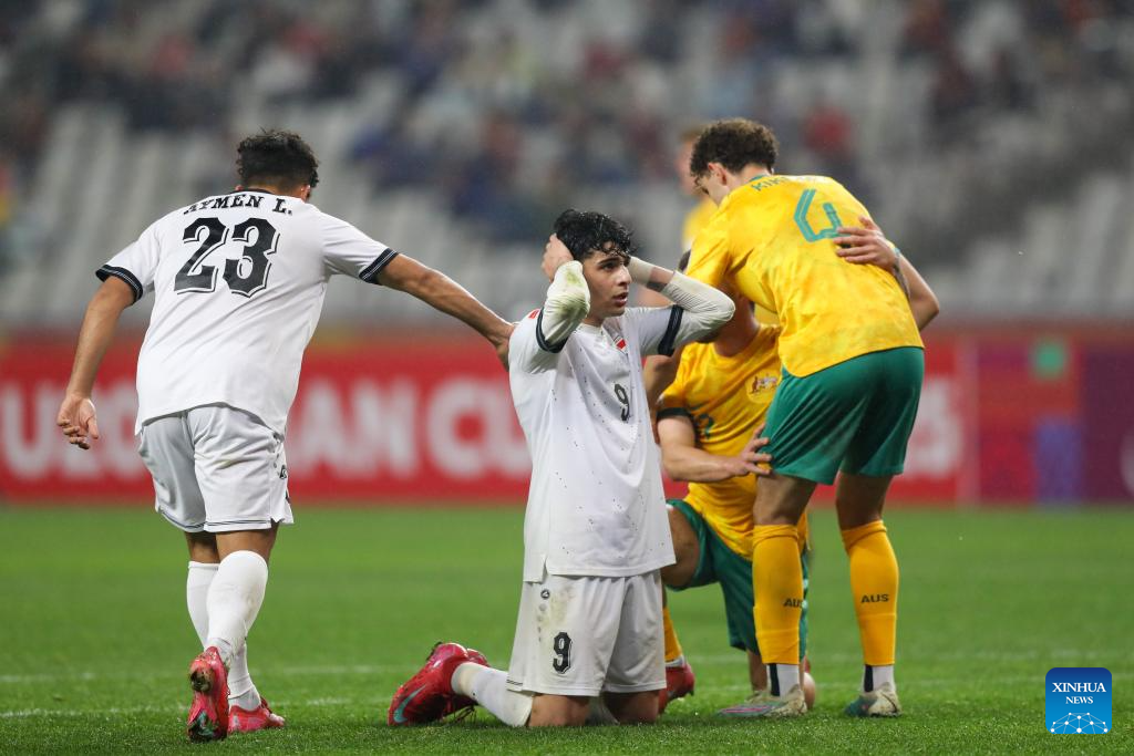 Mustafa Qabeel Mustafa (2nd L) of Iraq reacts after missing a goal during the quarterfinal between Australia and Iraq at the AFC U20 Asian Cup football tournament in Shenzhen, south China's Guangdong Province, Feb. 22, 2025. (Xinhua/Li Xulun)