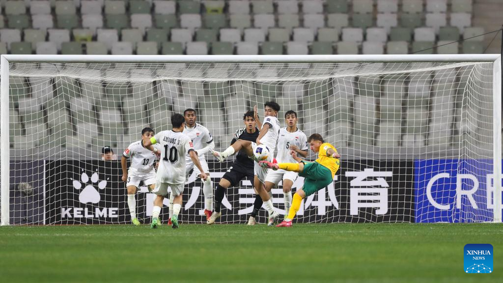 Luka Jovanovic (1st R) of Australia shoots during the quarterfinal between Australia and Iraq at the AFC U20 Asian Cup football tournament in Shenzhen, south China's Guangdong Province, Feb. 22, 2025. (Xinhua/Li Xulun)