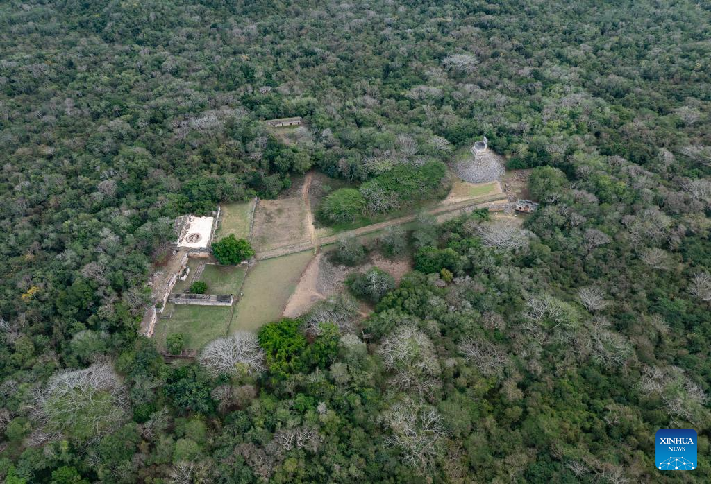 This aerial drone photo taken on Feb. 21, 2025 shows the Labna archaeological site in Yucatan, Mexico. The Puuc Route (Ruta Puuc) is located in Mexico's Yucatan state and is a route connecting several Mayan archaeological sites including Uxmal, Kabah and Labna. (Xinhua/Li Mengxin)