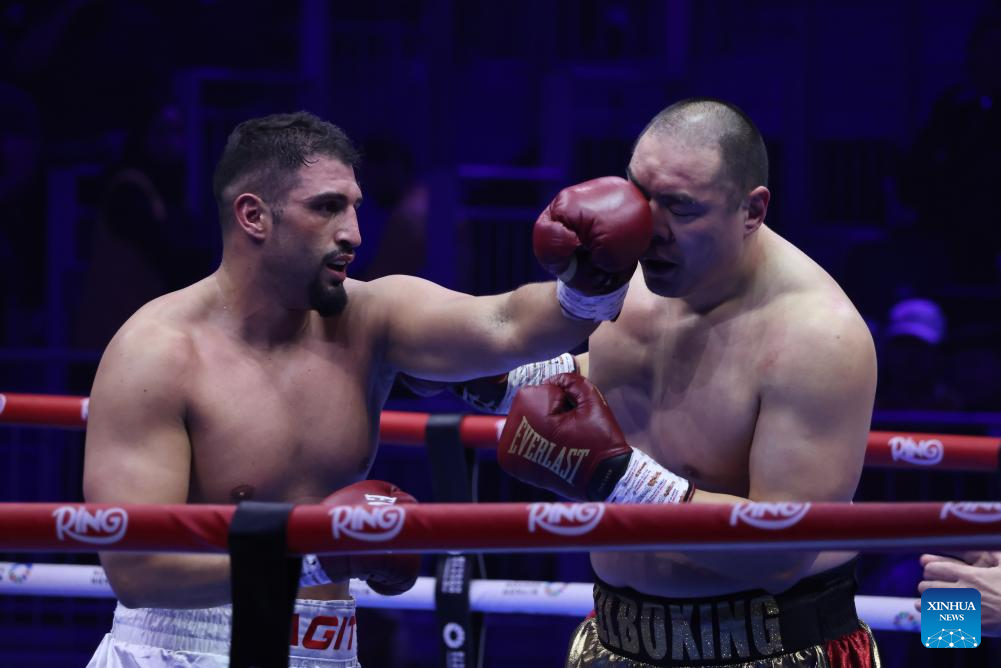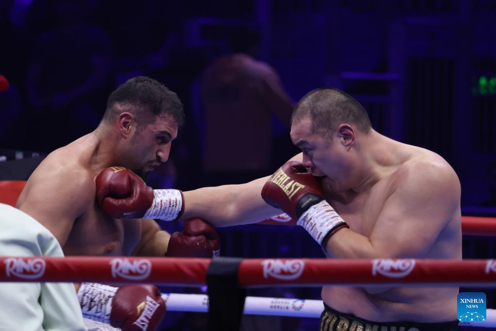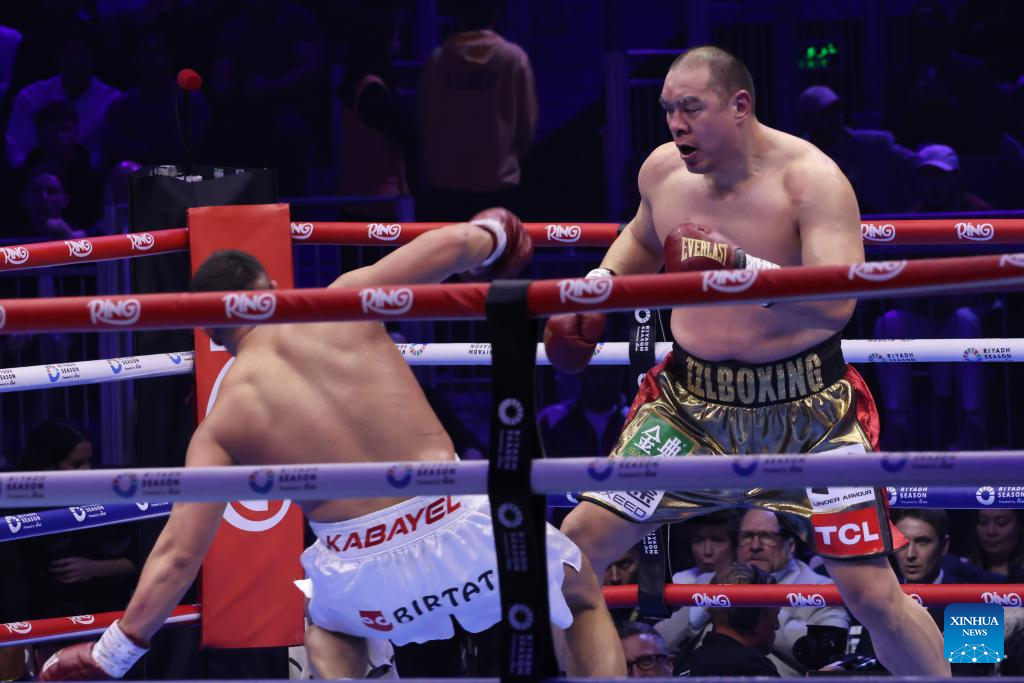 Zhang Zhilei (R) of China fights with Agit Kabayel of Germany during their WBC heavyweight interim title match in Riyadh, Saudi Arabia, Feb. 22, 2025. (Xinhua/Wang Haizhou)