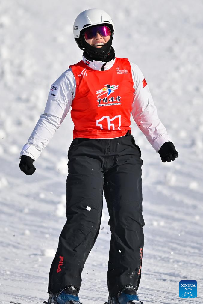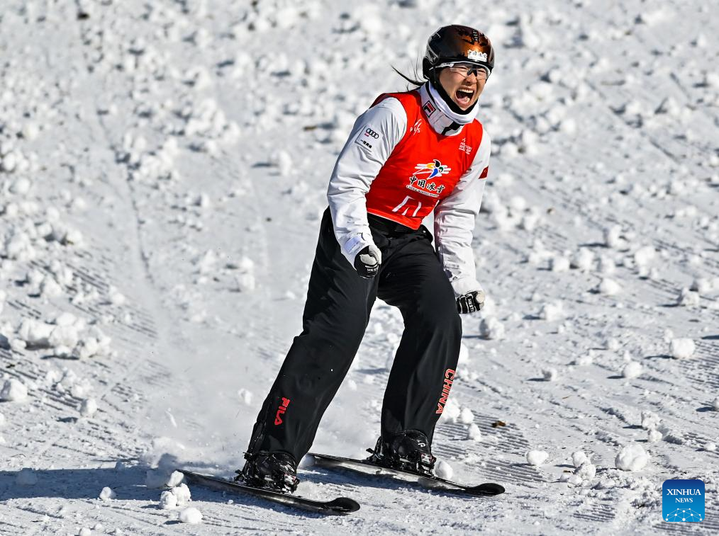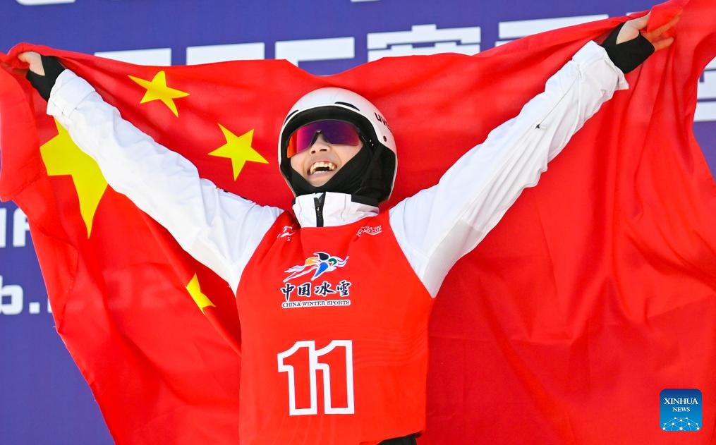 Xu Mengtao of China celebrates during the final of Women's Aerials at 2024-2025 FIS Freestyle Ski World Cup at the Beidahu Ski Resort in Jilin City, northeast China's Jilin Province, Feb. 23, 2025. (Xinhua/Yan Linyun)