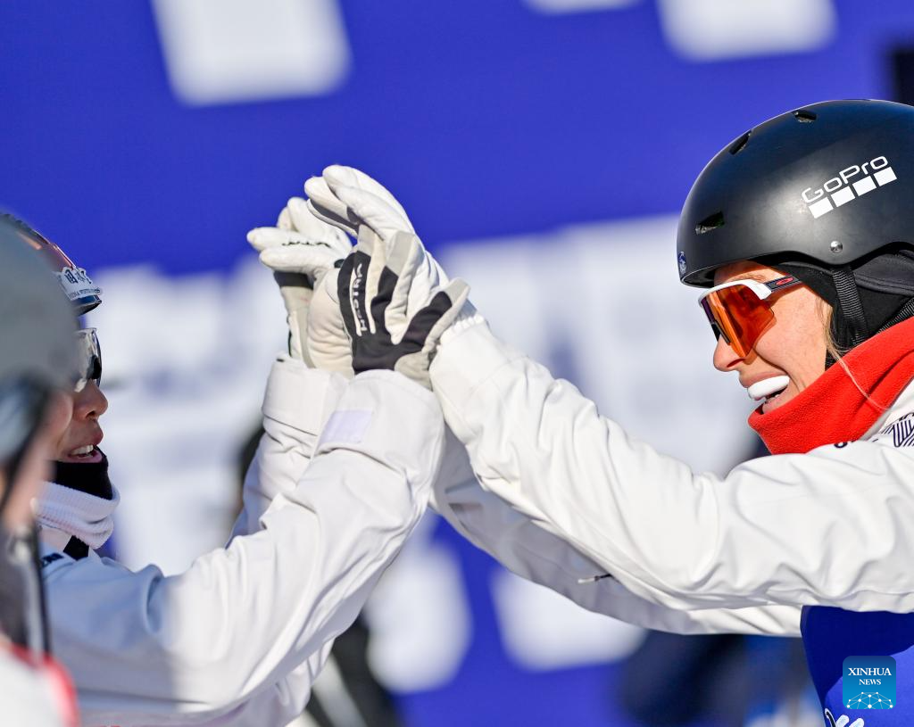 Danielle Scott (R) of Australia reacts after the final of Women's Aerials at 2024-2025 FIS Freestyle Ski World Cup at the Beidahu Ski Resort in Jilin City, northeast China's Jilin Province, Feb. 23, 2025. (Xinhua/Yan Linyun)