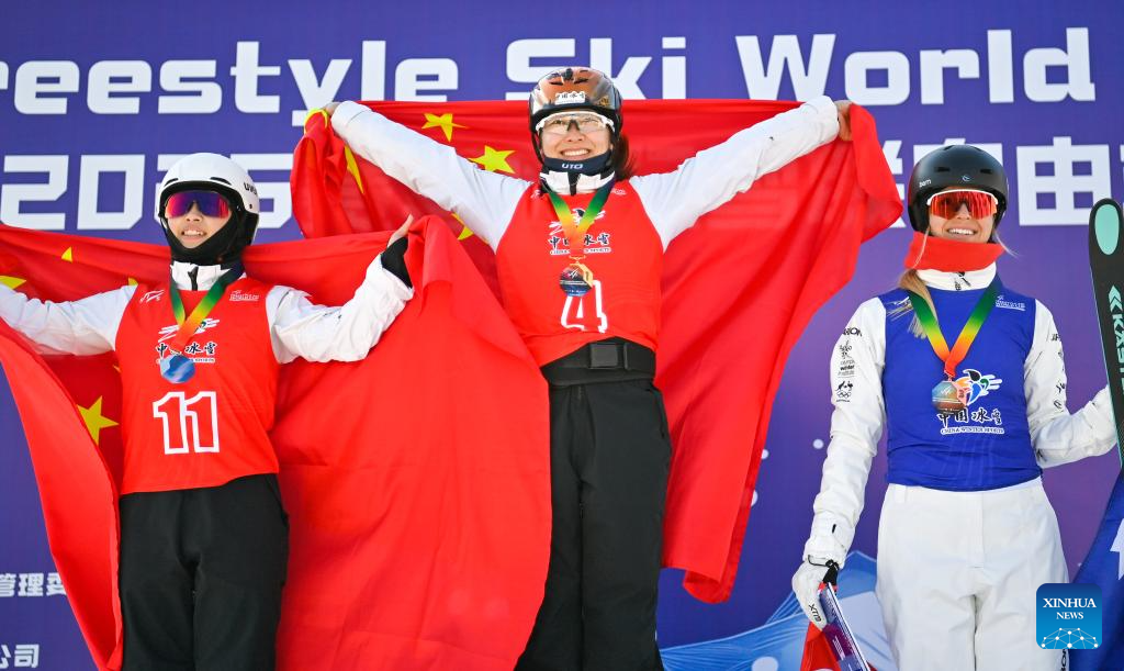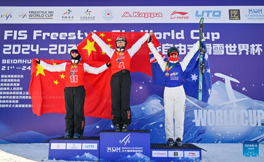 Gold medalist Xu Mengtao (C) of China, silver medalist Chen Meiting (L) of China and bronze medalist Danielle Scott of Australia pose on the podium during the awarding ceremony of the final of Women's Aerials at 2024-2025 FIS Freestyle Ski World Cup at the Beidahu Ski Resort in Jilin City, northeast China's Jilin Province, Feb. 23, 2025. (Xinhua/Yan Linyun)