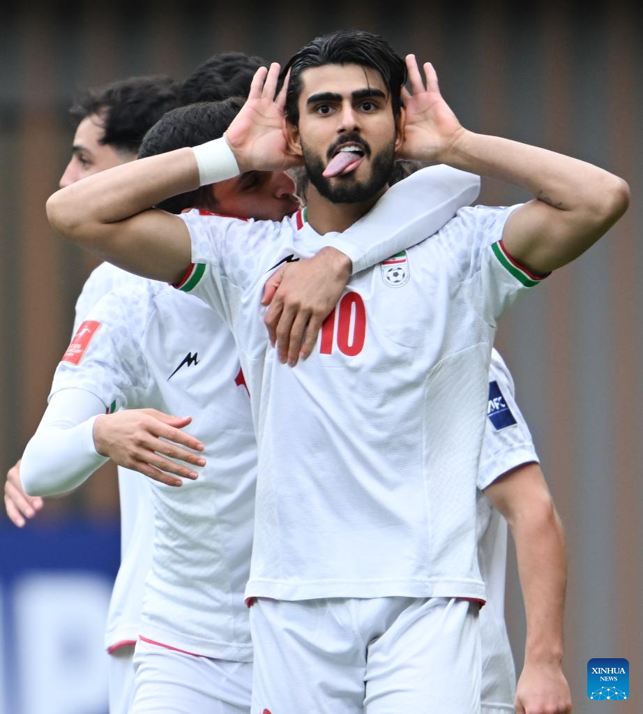 Reza Ghandi Pour (Front) of Iran celebrates scoring during the quarterfinal between Iran and Japan at the AFC U20 Asian Cup football tournament in Shenzhen, south China's Guangdong Province, Feb. 23, 2025. (Xinhua/Deng Hua)