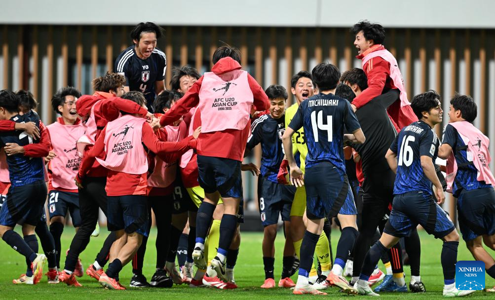 Players of Japan celebrate winning the quarterfinal between Iran and Japan at the AFC U20 Asian Cup football tournament in Shenzhen, south China's Guangdong Province, Feb. 23, 2025. (Xinhua/Deng Hua)