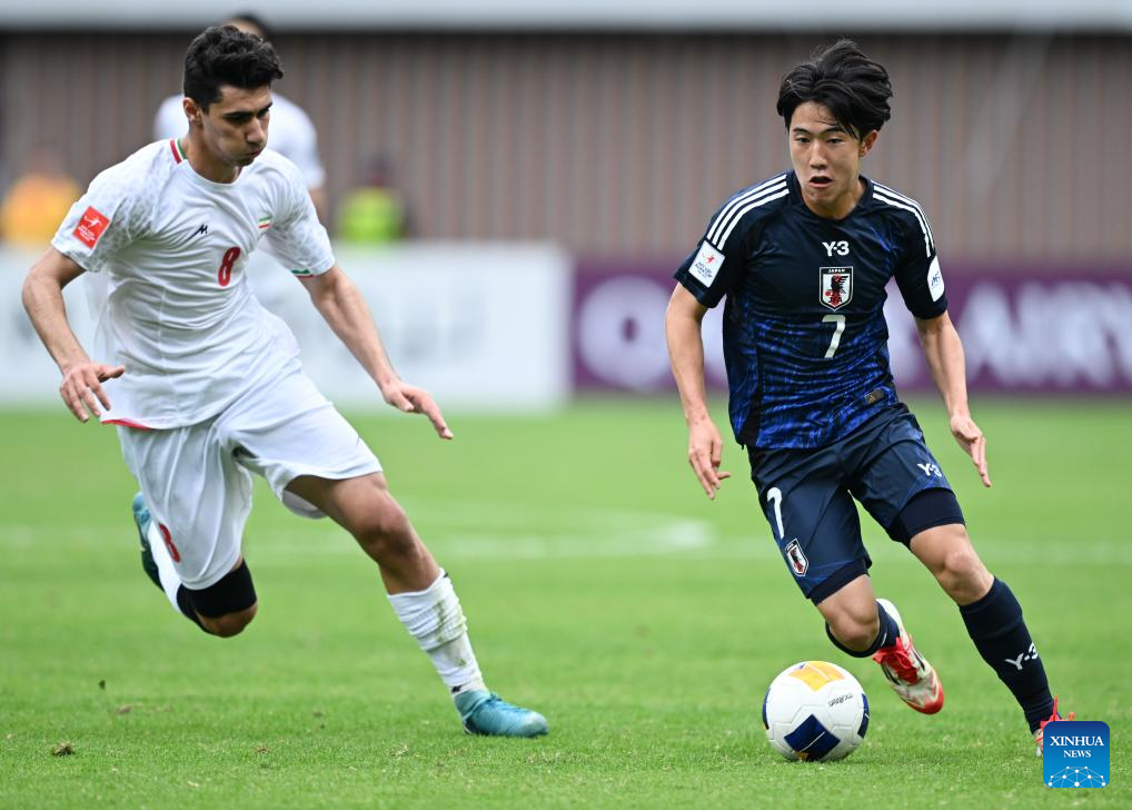 Sato Ryunosuke (R) of Japan competes during the quarterfinal between Iran and Japan at the AFC U20 Asian Cup football tournament in Shenzhen, south China's Guangdong Province, Feb. 23, 2025. (Xinhua/Deng Hua)