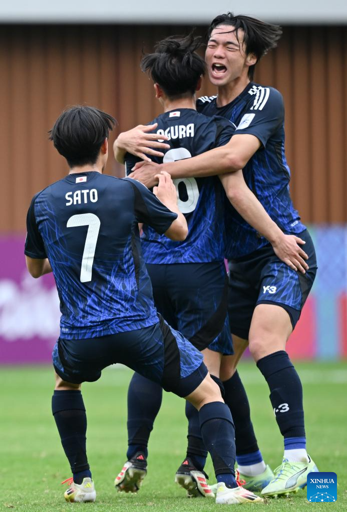 Players of Japan celebrates scoring during the quarterfinal between Iran and Japan at the AFC U20 Asian Cup football tournament in Shenzhen, south China's Guangdong Province, Feb. 23, 2025. (Xinhua/Deng Hua)
