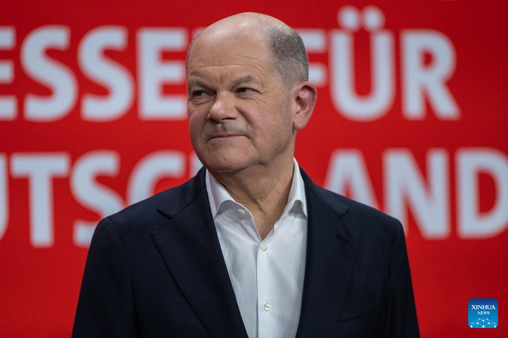 German Chancellor Olaf Scholz (L) attends a campaign event at the headquarters of the Social Democratic Party (SPD) in Berlin, Germany, Feb. 23, 2025.