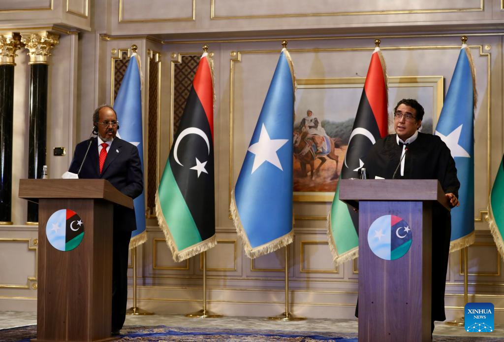 TRIPOLI, Feb. 24 (Xinhua) -- President of the Libyan Presidency Council Mohamed Menfi emphasized the importance of Libya-Somalia cooperation during a press conference on Monday following talks with visiting Somali President Hassan Sheikh Mohamud.
