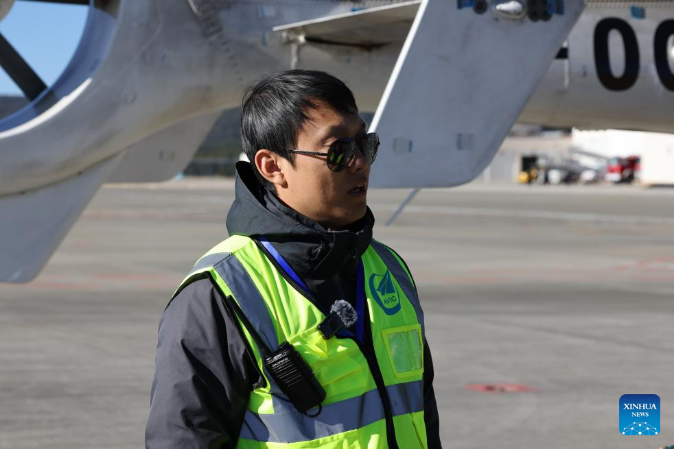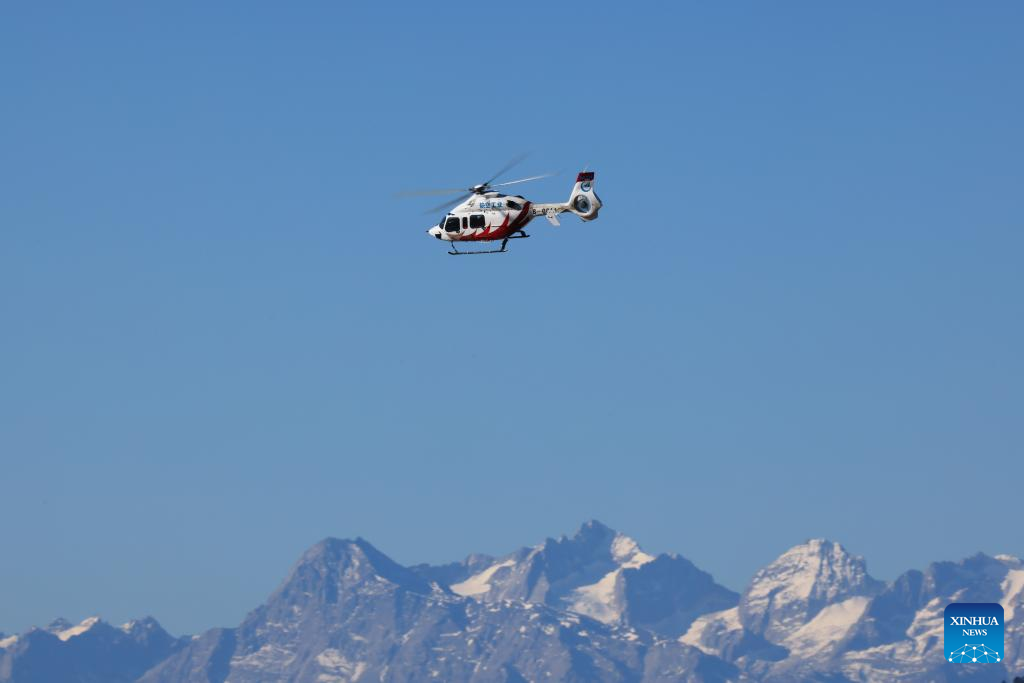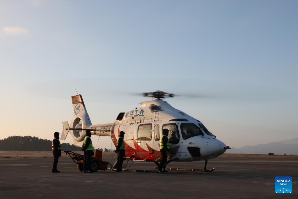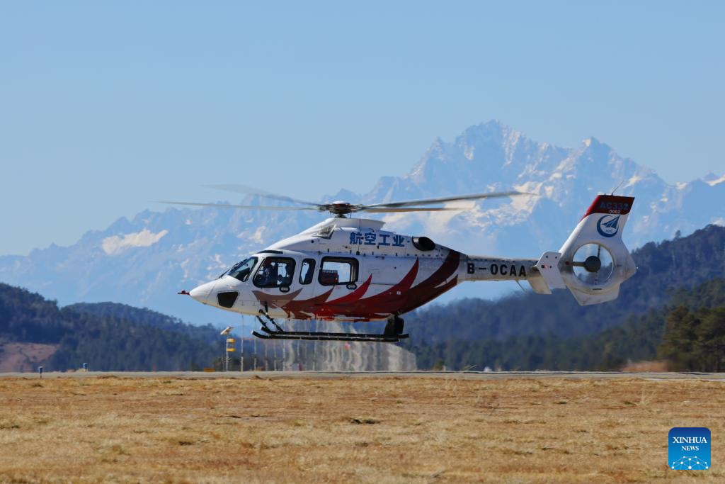 BEIJING, Feb. 25 (Xinhua) -- With a snow-capped mountain in sight, helicopter designer Li Shengwei paced up and down at Ninglang Lugu Lake Airport with an altitude of 3,292.9 meters, keeping a close eye on an AC332 helicopter undergoing its plateau flight test.