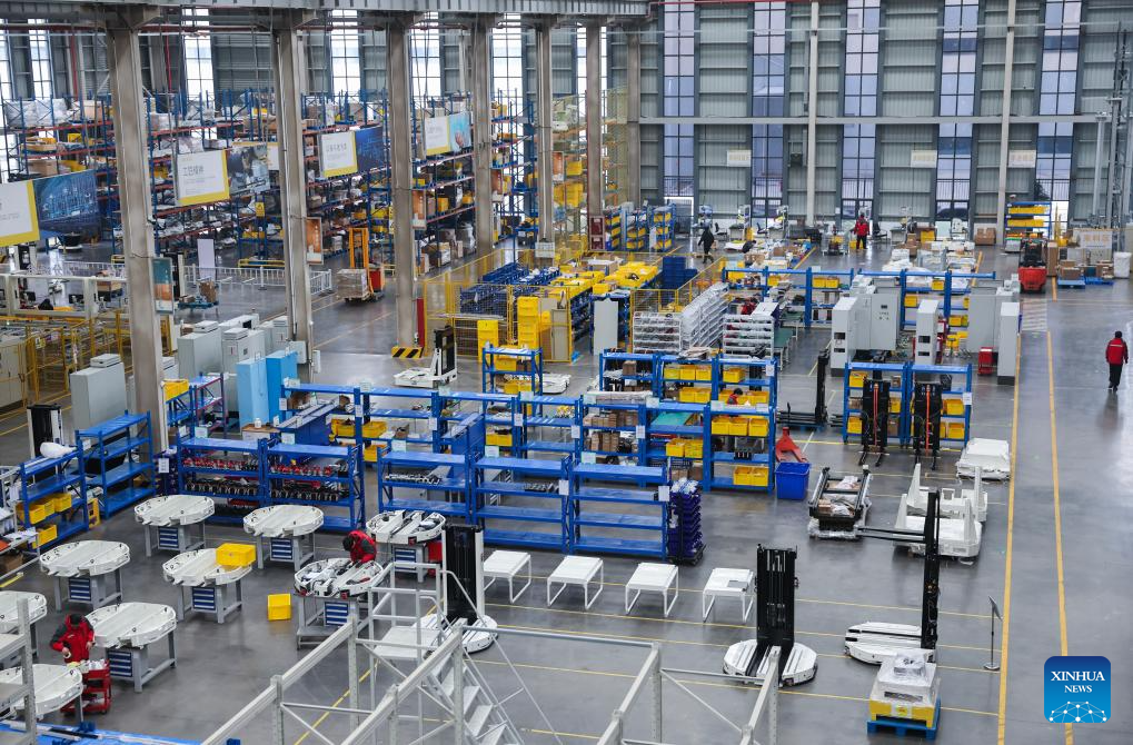Employees work at the assembly area of shuttles in Galaxis Technology in Nanhu District of Jiaxing, east China's Zhejiang Province, Feb. 25, 2025. Local authorities in Nanhu District have continuously implemented diversified measures in recent years to address enterprises' demands, improve business environment, and promote healthy, high-quality development of private economy. (Xinhua/Xu Yu)