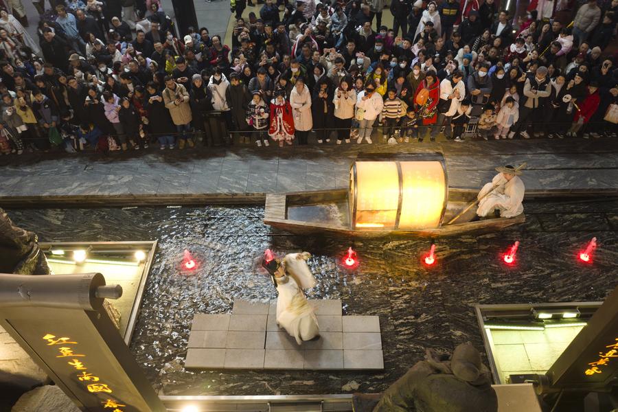 An aerial drone photo shows tourists visiting the Grand Tang Mall in Xi'an, northwest China's Shaanxi Province, Feb. 2, 2024. (Xinhua/Shao Rui)