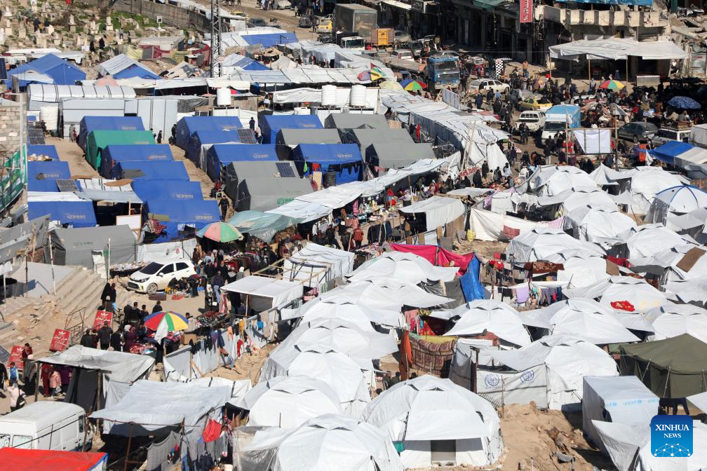This photo shows a view of one of the displacement camps at the Al-Shujaiya neighborhood in Gaza City, on Feb. 25, 2025. (Photo by Rizek Abdeljawad/Xinhua)