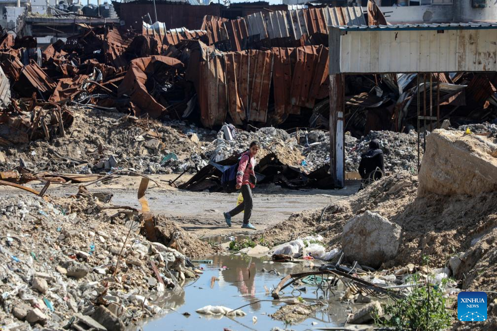 A Palestinian child walks in one of the displacement camps at the Al-Shujaiya neighborhood in Gaza City, on Feb. 25, 2025. (Photo by Rizek Abdeljawad/Xinhua)