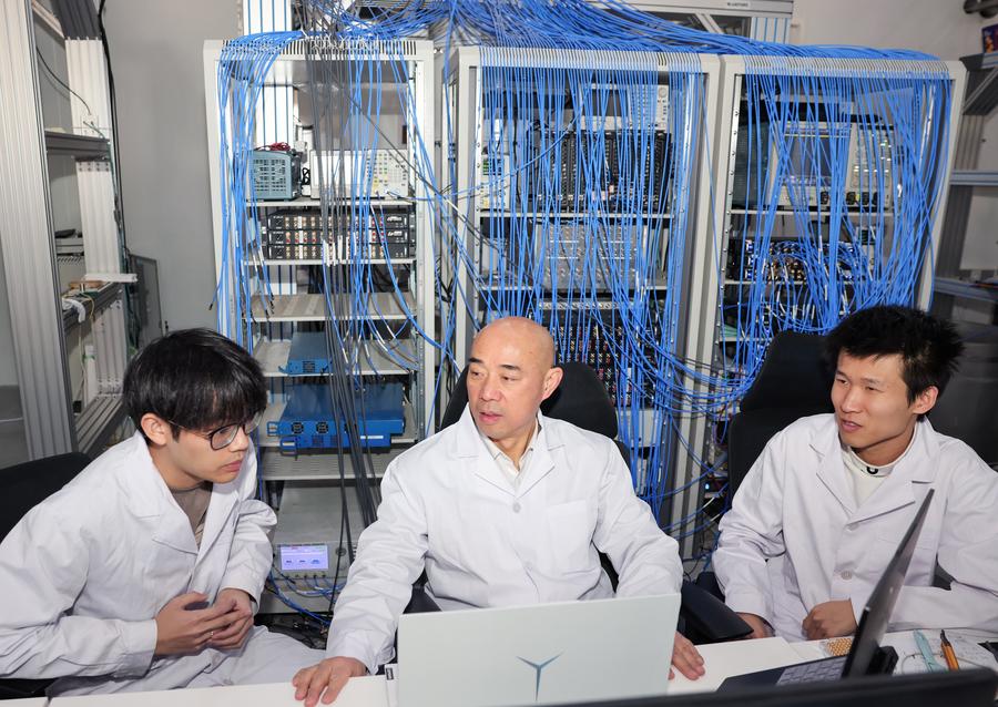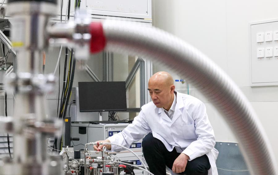 Researchers work at an experimental station of the Synergetic Extreme Condition User Facility (SECUF) in Huairou District, Beijing, capital of China, Feb. 25, 2025. (Xinhua/Yin Gang)