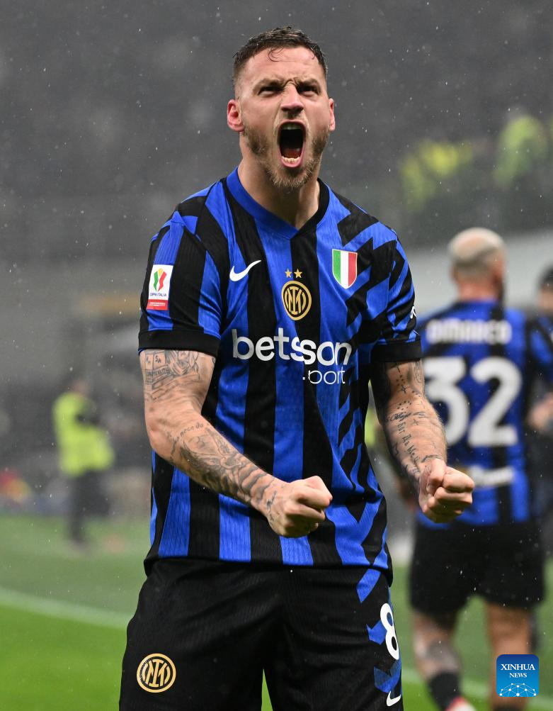 Inter Milan's Marko Arnautovic celebrates his goal during the Italian Cup quarterfinal football match between Inter Milan and Lazio in Milan, Italy, Feb. 25, 2025. (Photo by Alberto Lingria/Xinhua)