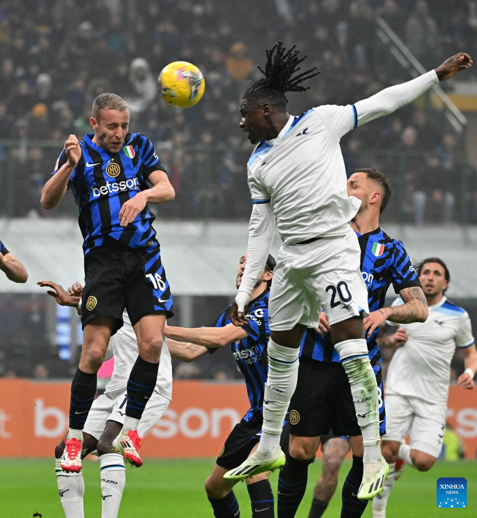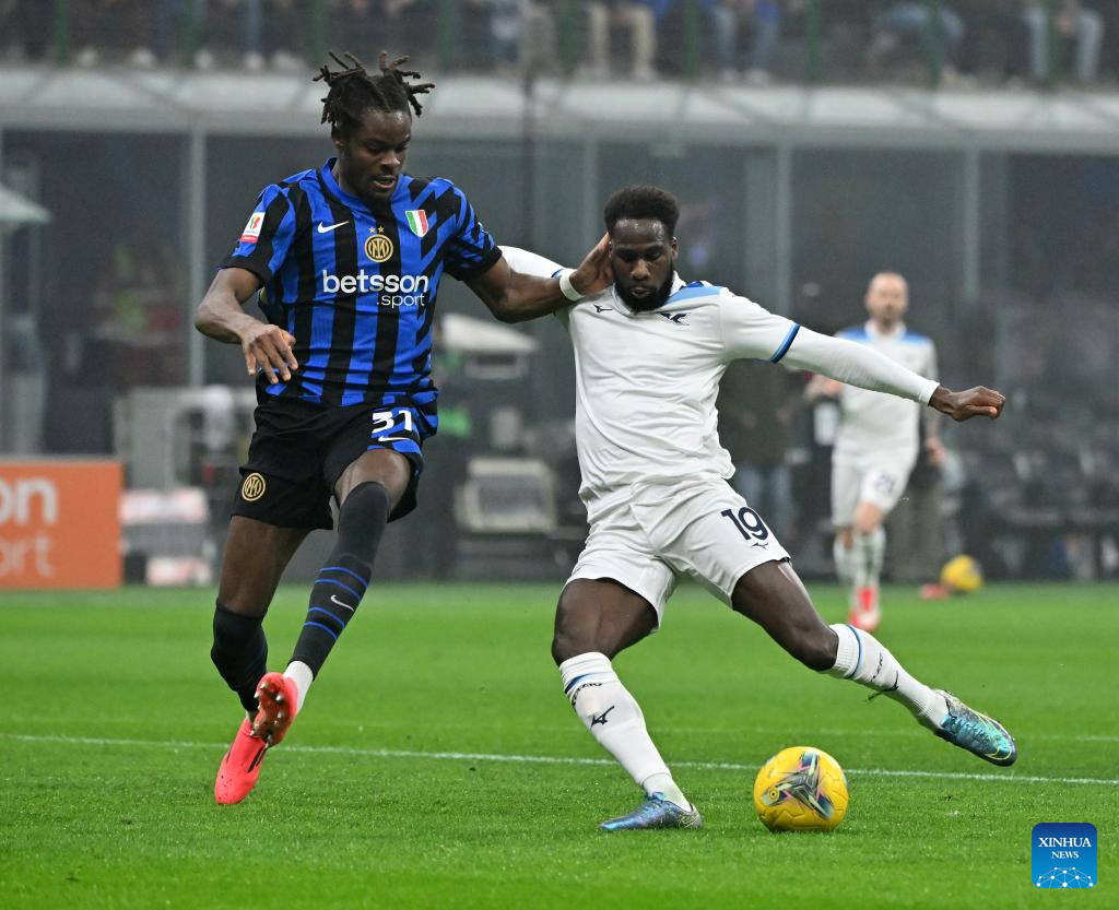 Inter Milan's Yann Bisseck (L) vies with Lazio's Boulaye Dia during the Italian Cup quarterfinal football match between Inter Milan and Lazio in Milan, Italy, Feb. 25, 2025. (Photo by Alberto Lingria/Xinhua)