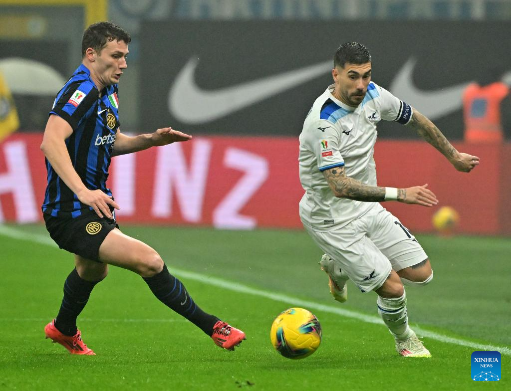 Inter Milan's Benjamin Pavard (L) vies with Lazio's Mattia Zaccagni during the Italian Cup quarterfinal football match between Inter Milan and Lazio in Milan, Italy, Feb. 25, 2025. (Photo by Alberto Lingria/Xinhua)