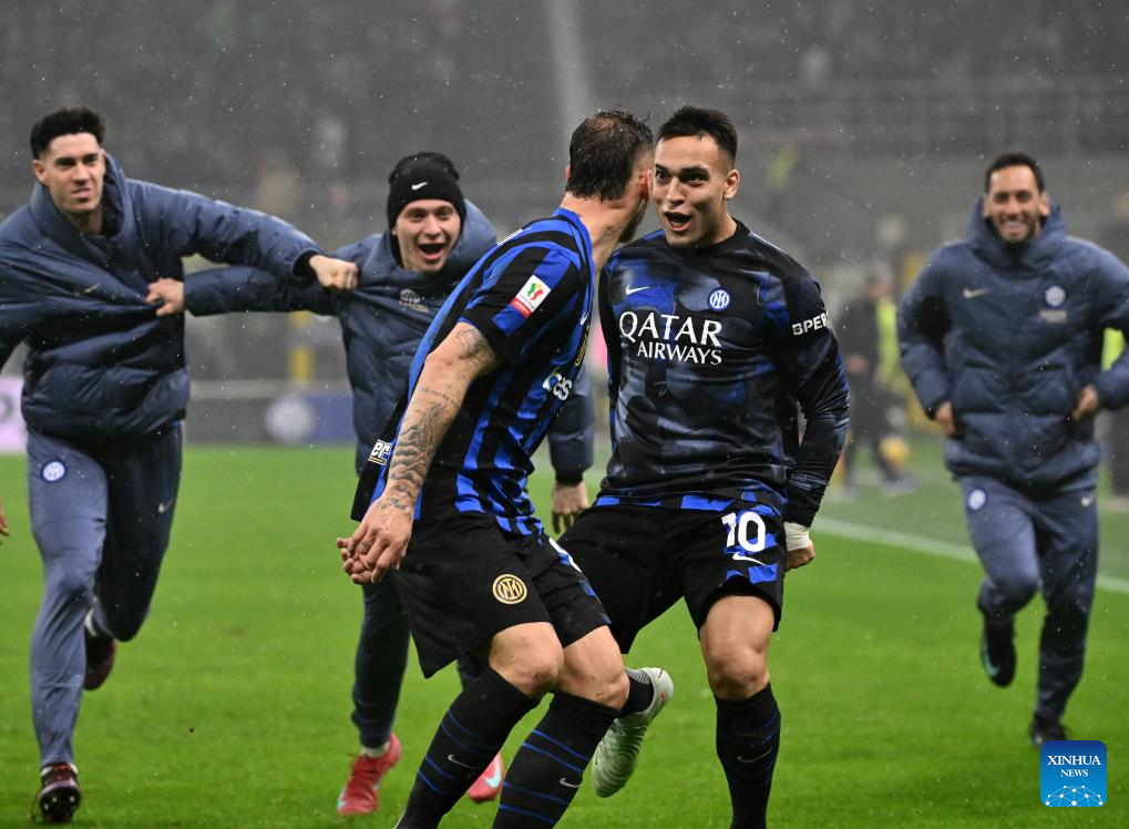 Inter Milan's Marko Arnautovic (Front) celebrates his goal with his teammates during the Italian Cup quarterfinal football match between Inter Milan and Lazio in Milan, Italy, Feb. 25, 2025. (Photo by Alberto Lingria/Xinhua)