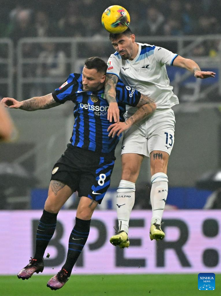Inter Milan's Davide Frattesi (L) vies with Lazio's Loum Tchaouna (R) during the Italian Cup quarterfinal football match between Inter Milan and Lazio in Milan, Italy, Feb. 25, 2025. (Photo by Alberto Lingria/Xinhua)