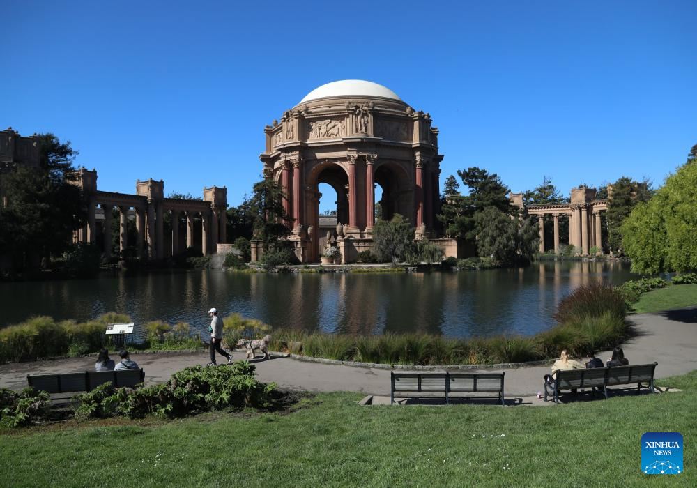 Tourists enjoy the sunshine at the Palace of Fine Arts in San Francisco, the United States, on Feb. 25, 2025. (Photo by Liu Yilin/Xinhua)