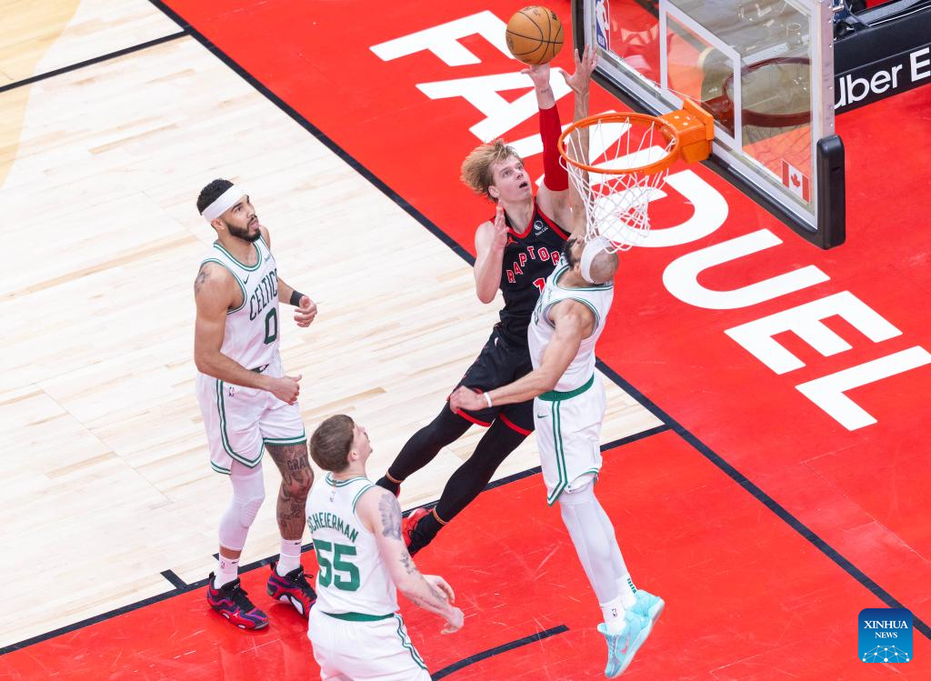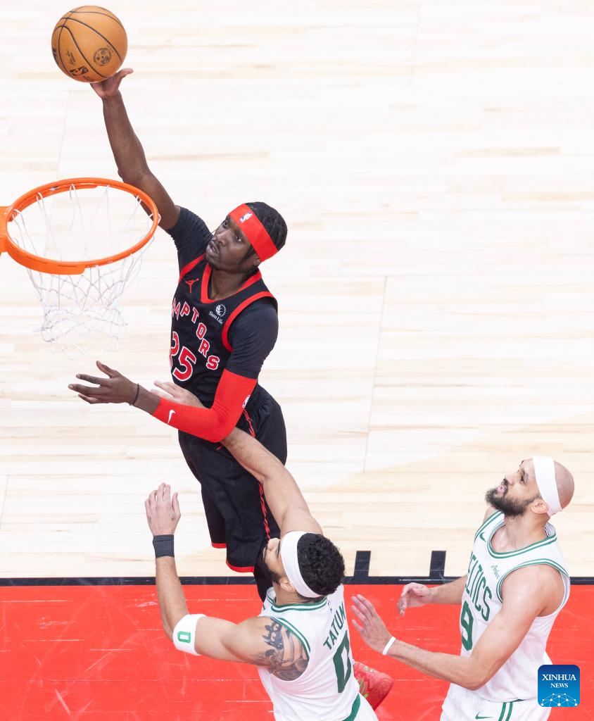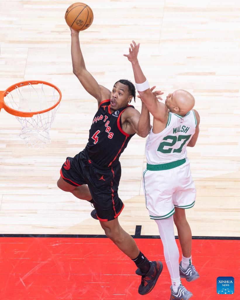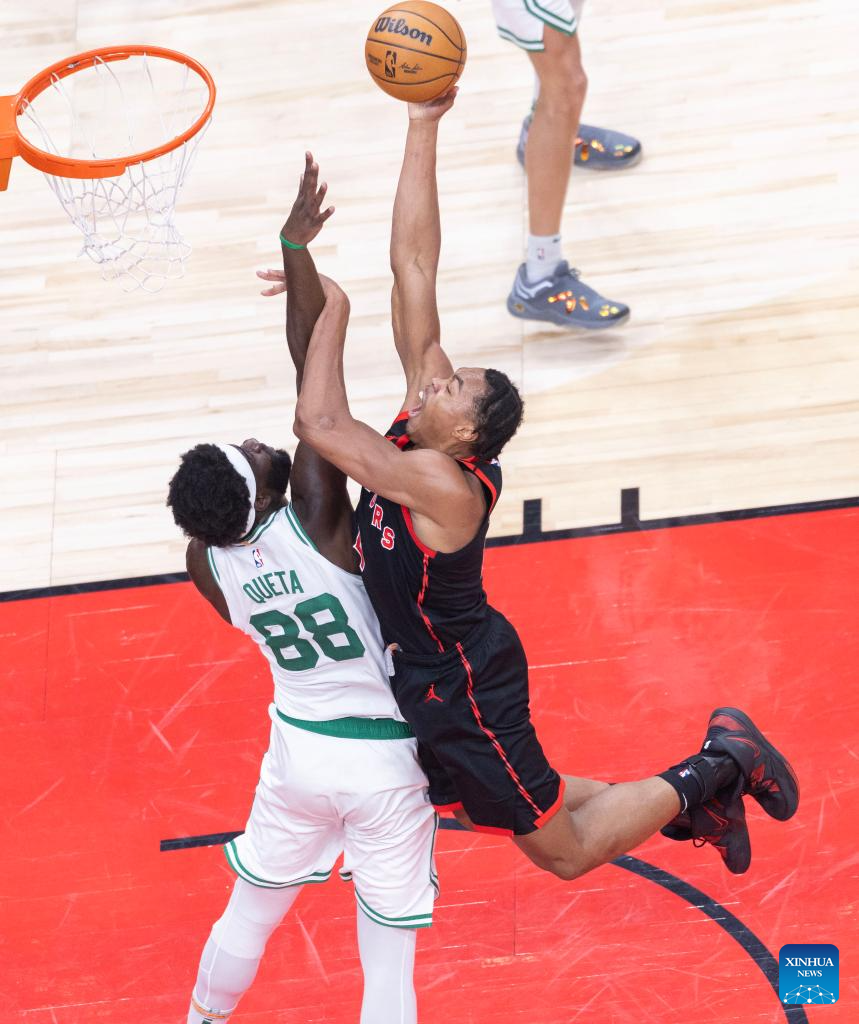 Gradey Dick (2nd R) of Toronto Raptors goes up for a layup during the 2024-2025 NBA regular season game between Toronto Raptors and Boston Celtics in Toronto, Canada, on Feb. 25, 2025. (Photo by Zou Zheng/Xinhua)