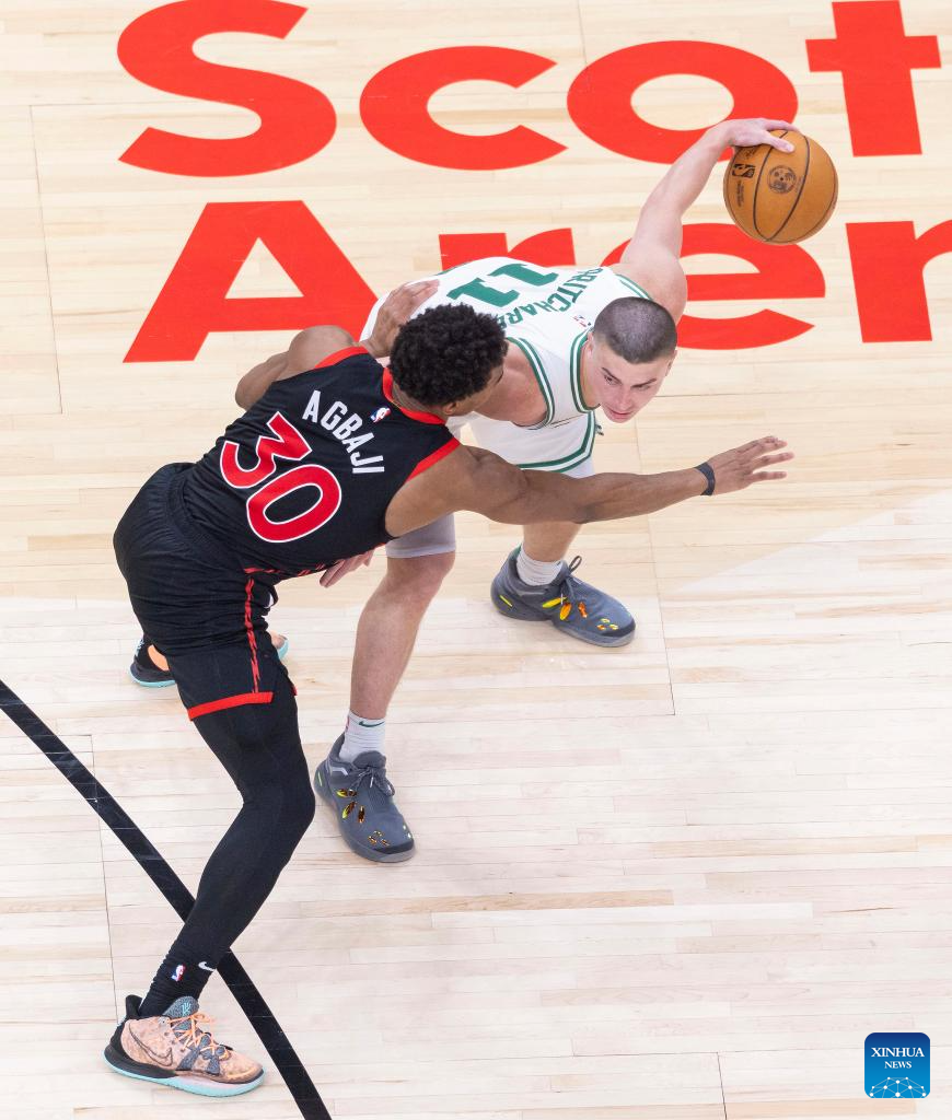 Payton Pritchard (R) of Boston Celtics breaks through against Ochai Agbaji of Toronto Raptors during the 2024-2025 NBA regular season game between Toronto Raptors and Boston Celtics in Toronto, Canada, on Feb. 25, 2025. (Photo by Zou Zheng/Xinhua)