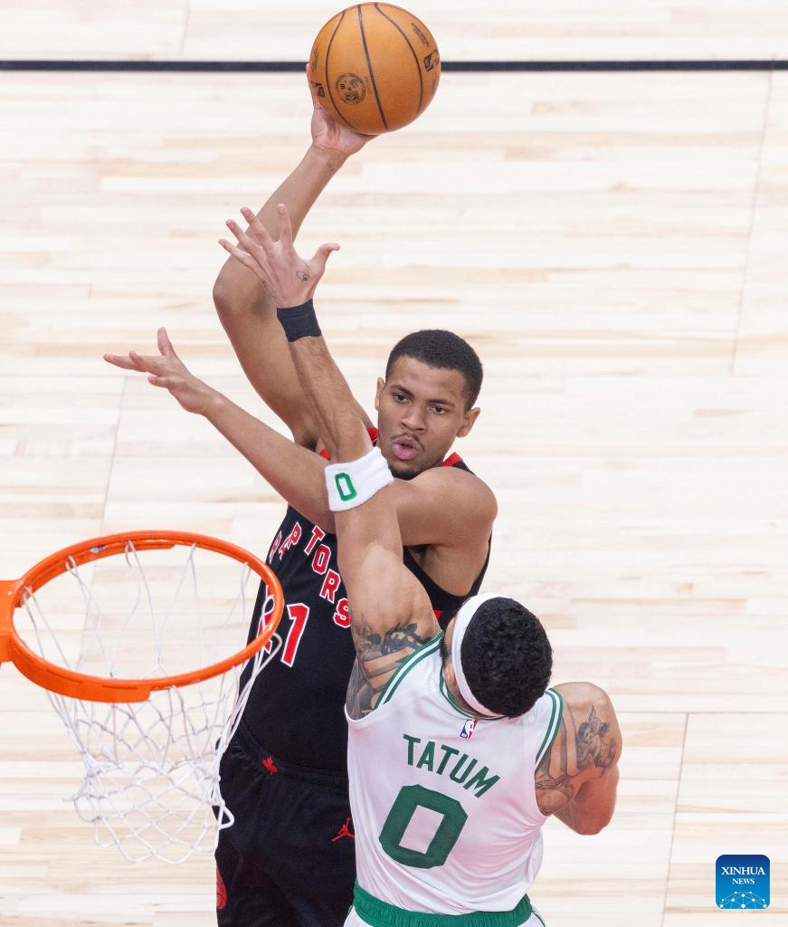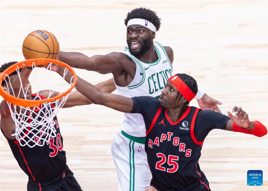 Chris Boucher (R) of Toronto Raptors fights for a rebound with Neemias Queta (C) of Boston Celtics during the 2024-2025 NBA regular season game between Toronto Raptors and Boston Celtics in Toronto, Canada, on Feb. 25, 2025. (Photo by Zou Zheng/Xinhua)