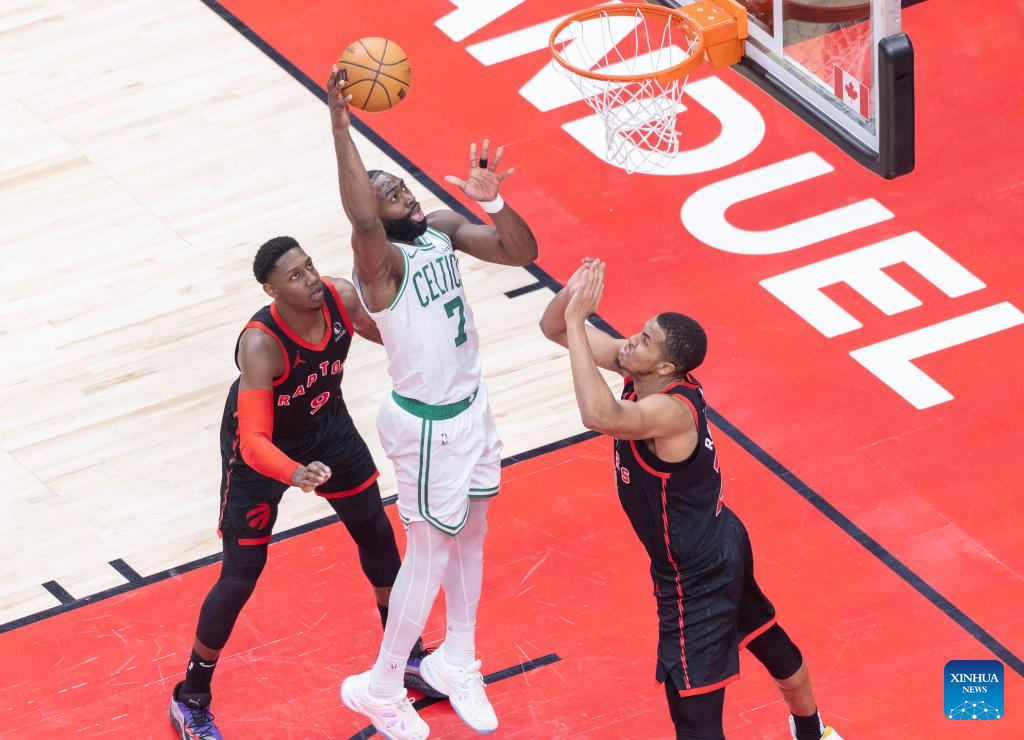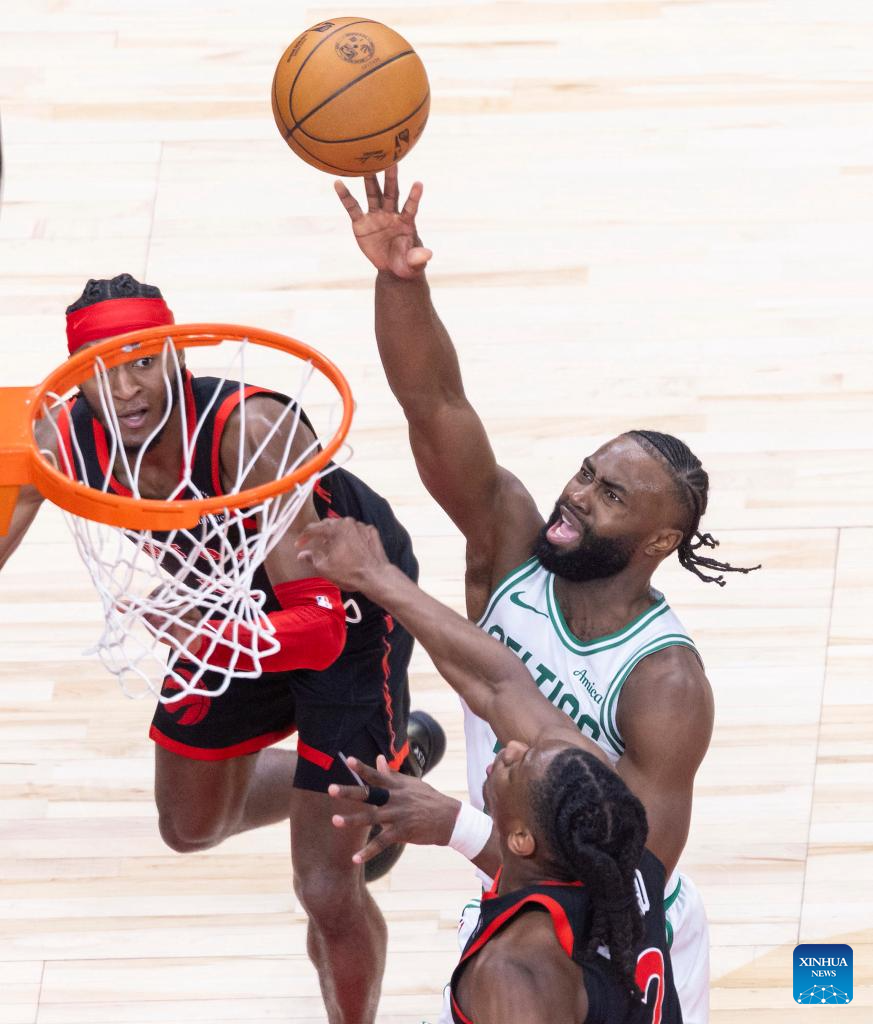 Jaylen Brown (C) of Boston Celtics makes a layup during the 2024-2025 NBA regular season game between Toronto Raptors and Boston Celtics in Toronto, Canada, on Feb. 25, 2025. (Photo by Zou Zheng/Xinhua)